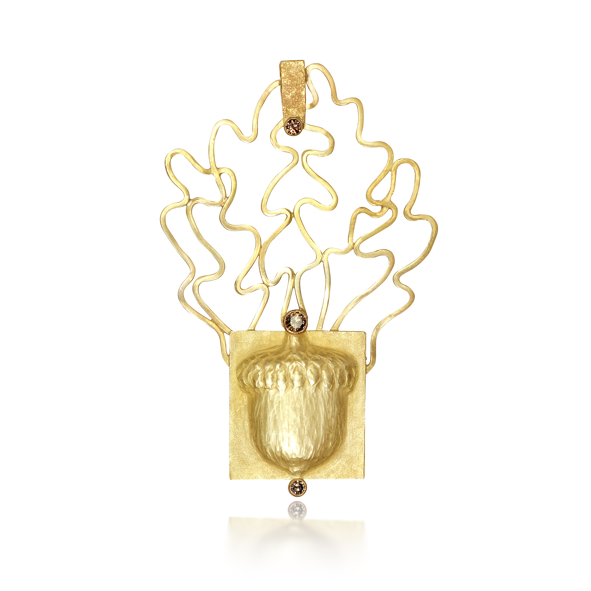 14k repoussé acorn pendant has 3 brown diamonds 28pt .