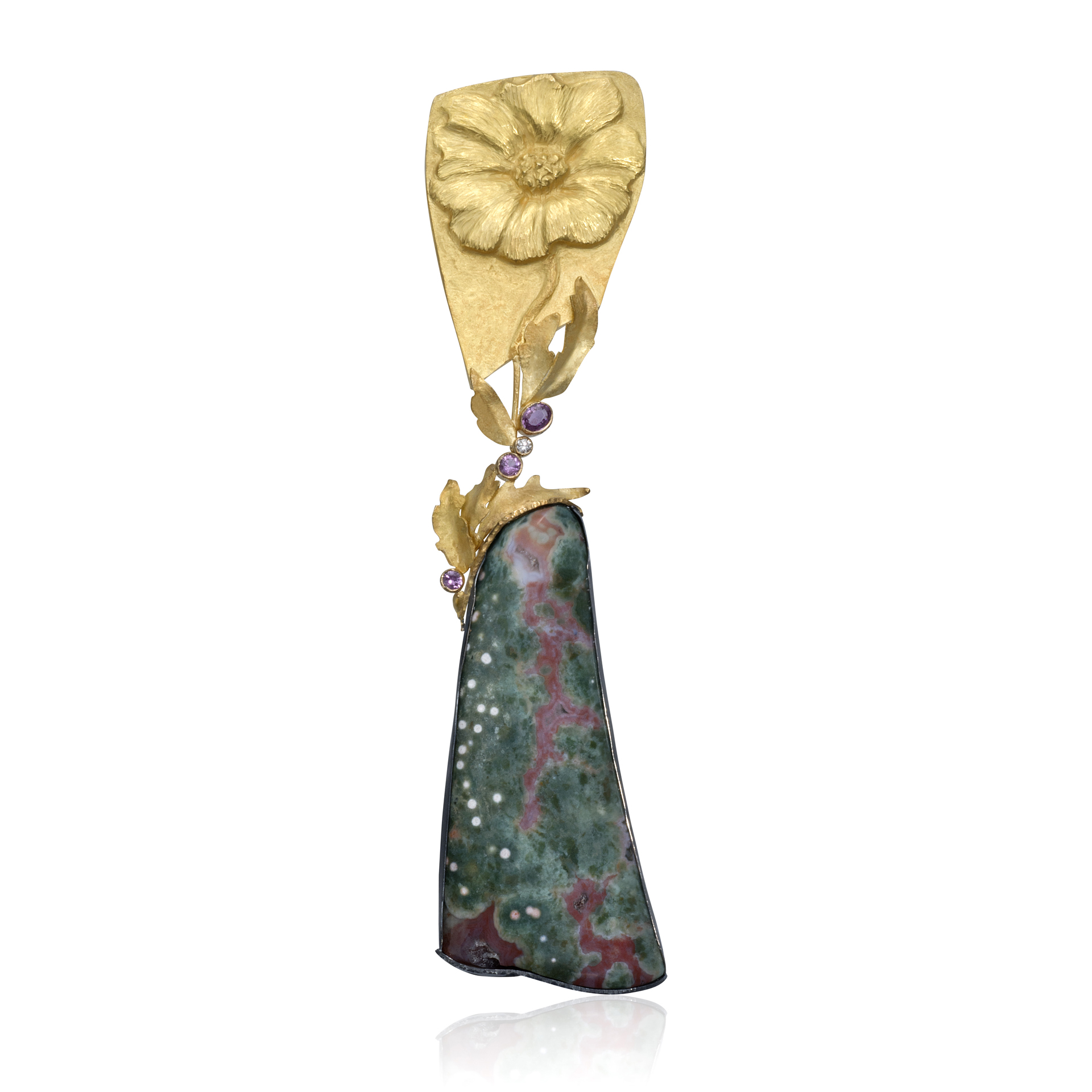 The top is 14k repussé althea flower with a pink sapphire and diamond. The bottom is an ocean jasper that was cut to imply the root seeds and water that is needed for the flpwer. On the side is gold leaves and pink sapphires