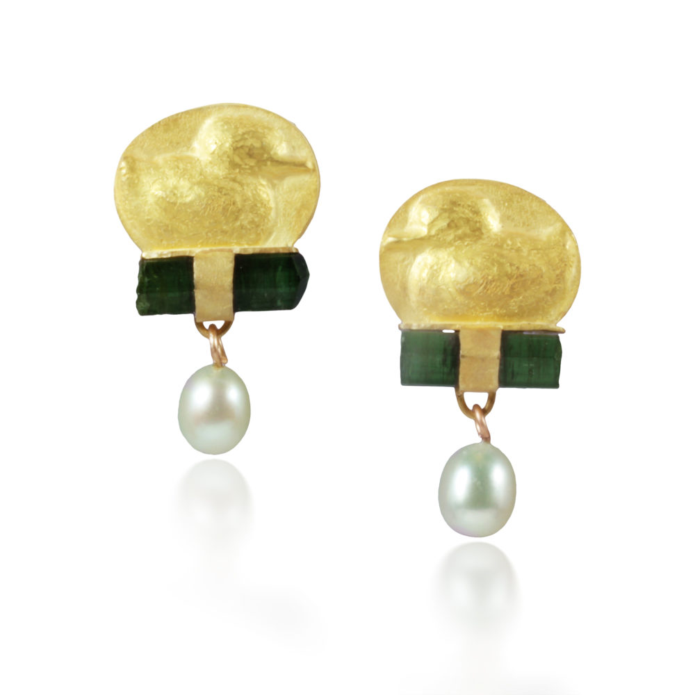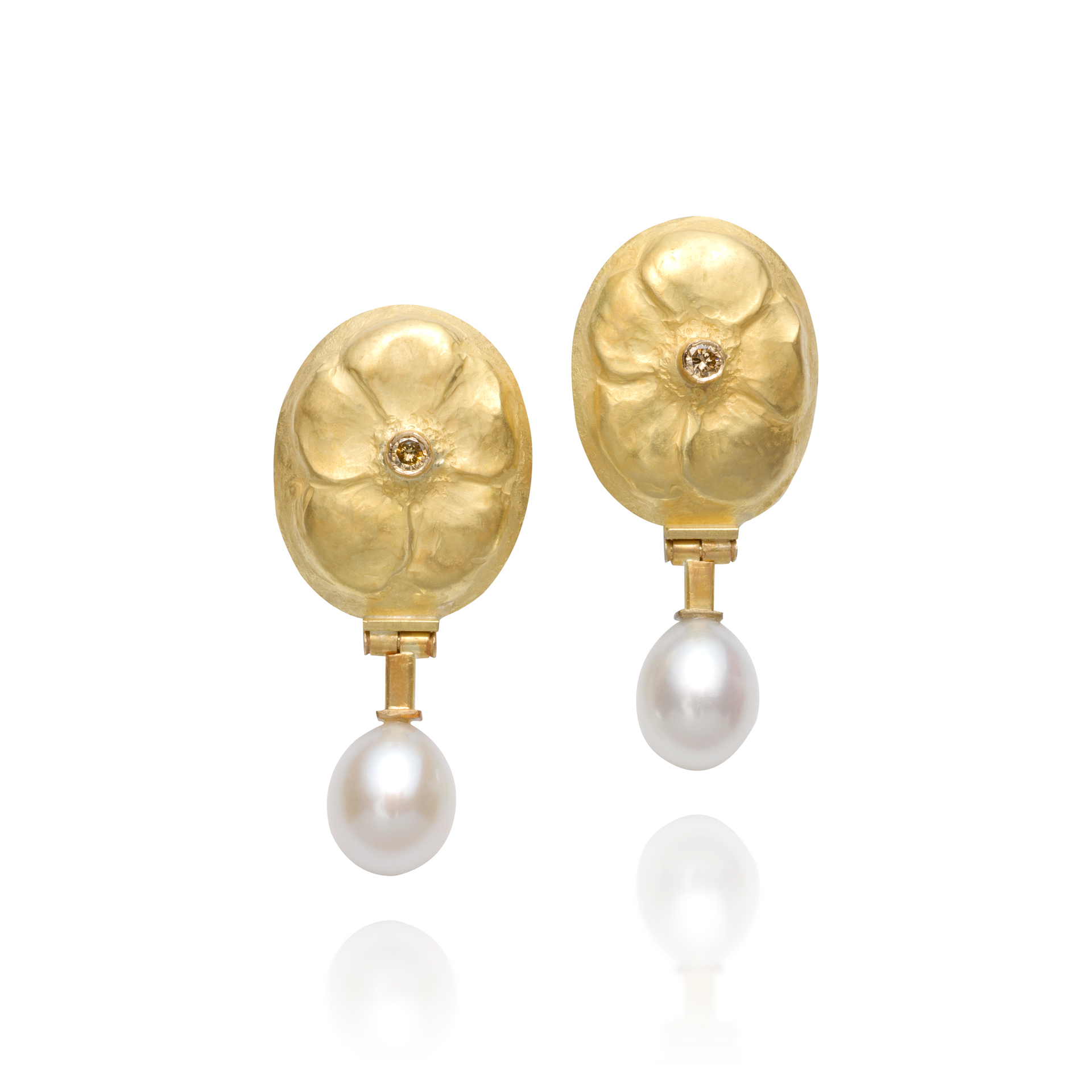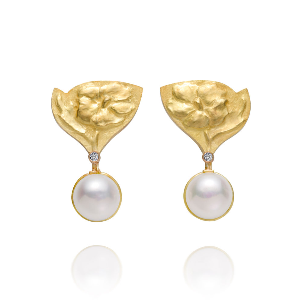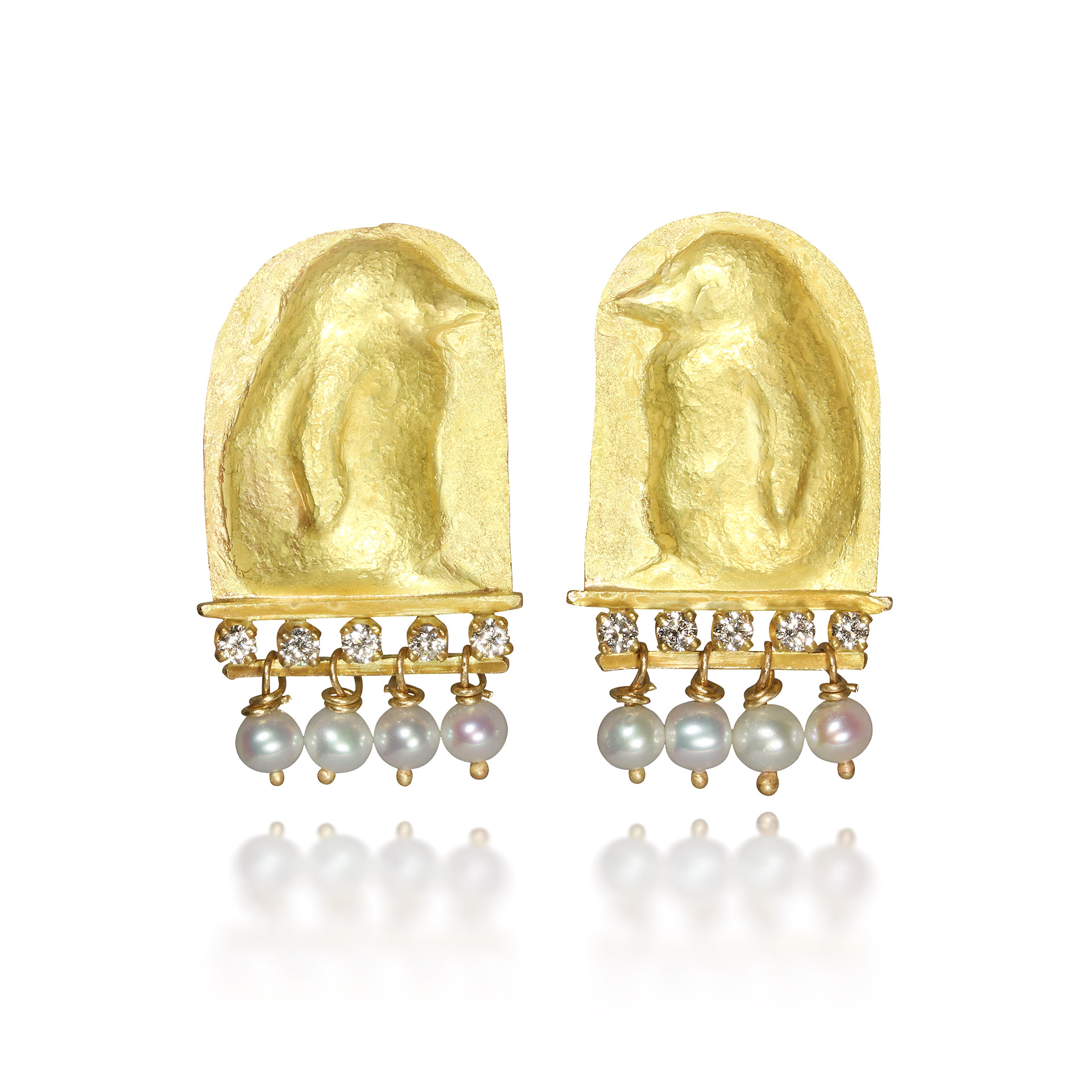 Ice and Snow Balls, Baby Penguins are 14k gold post earrings . The penguins are repoussé sculptures and are standing on ice/diamonds with pearl snow balls.