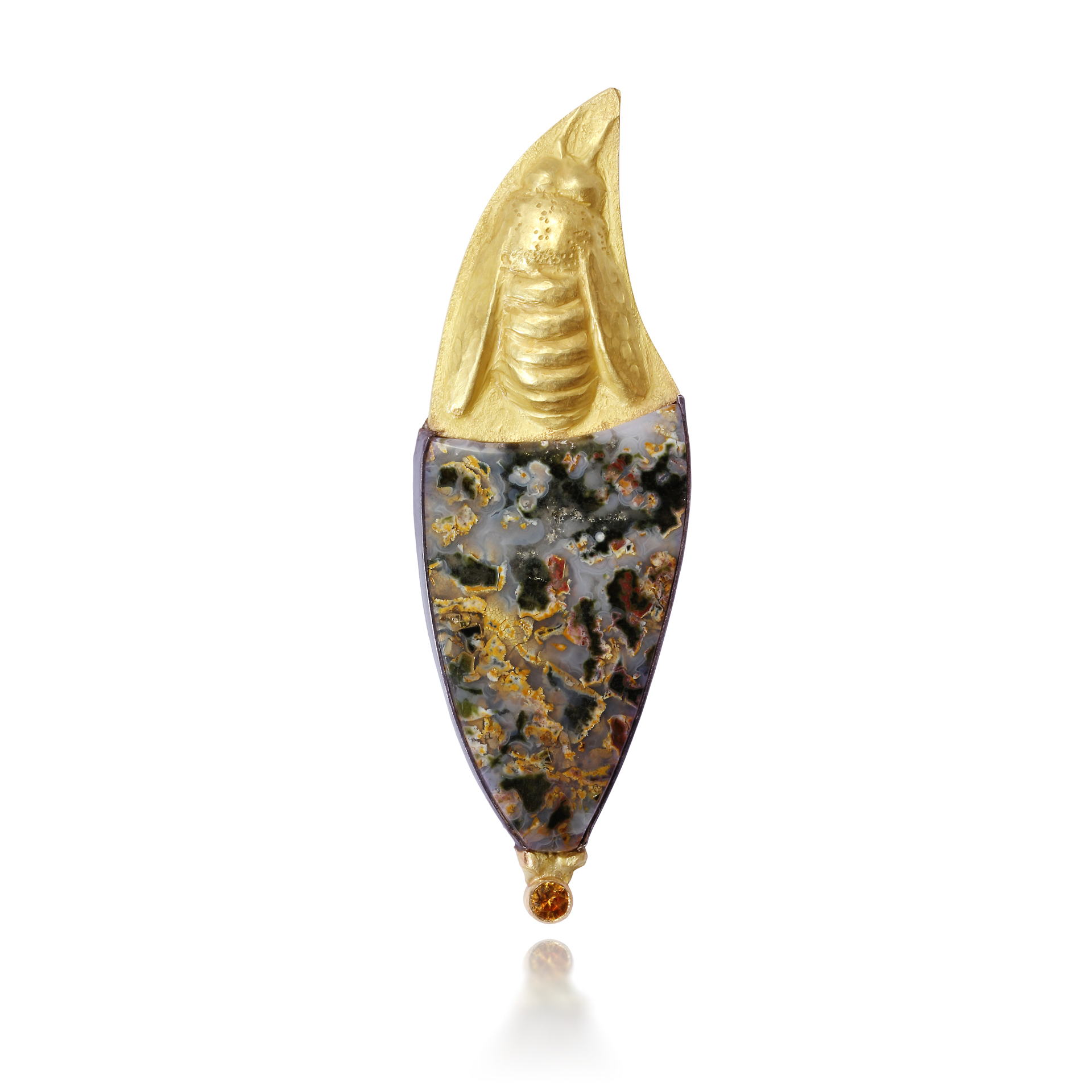 This is a brooch/ pendant, the top is a 14k repoussé bee that is on top of ocean jasper which is set in patinated silver. At he very bottom there is a honey colored sapphire
