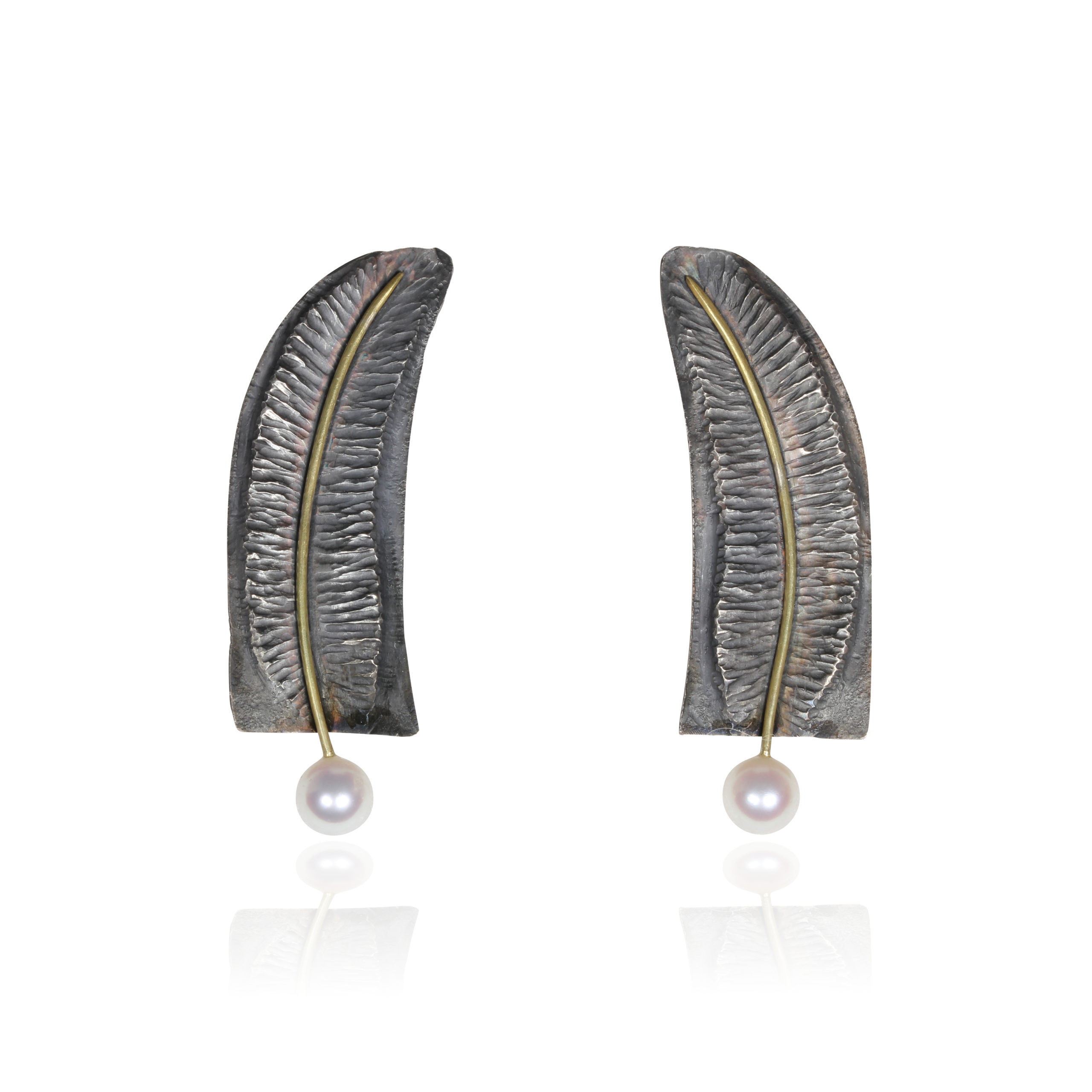 Oxidized silver earring of feathers that have a 14k spine and pearls on the bottom. These are post earrings.