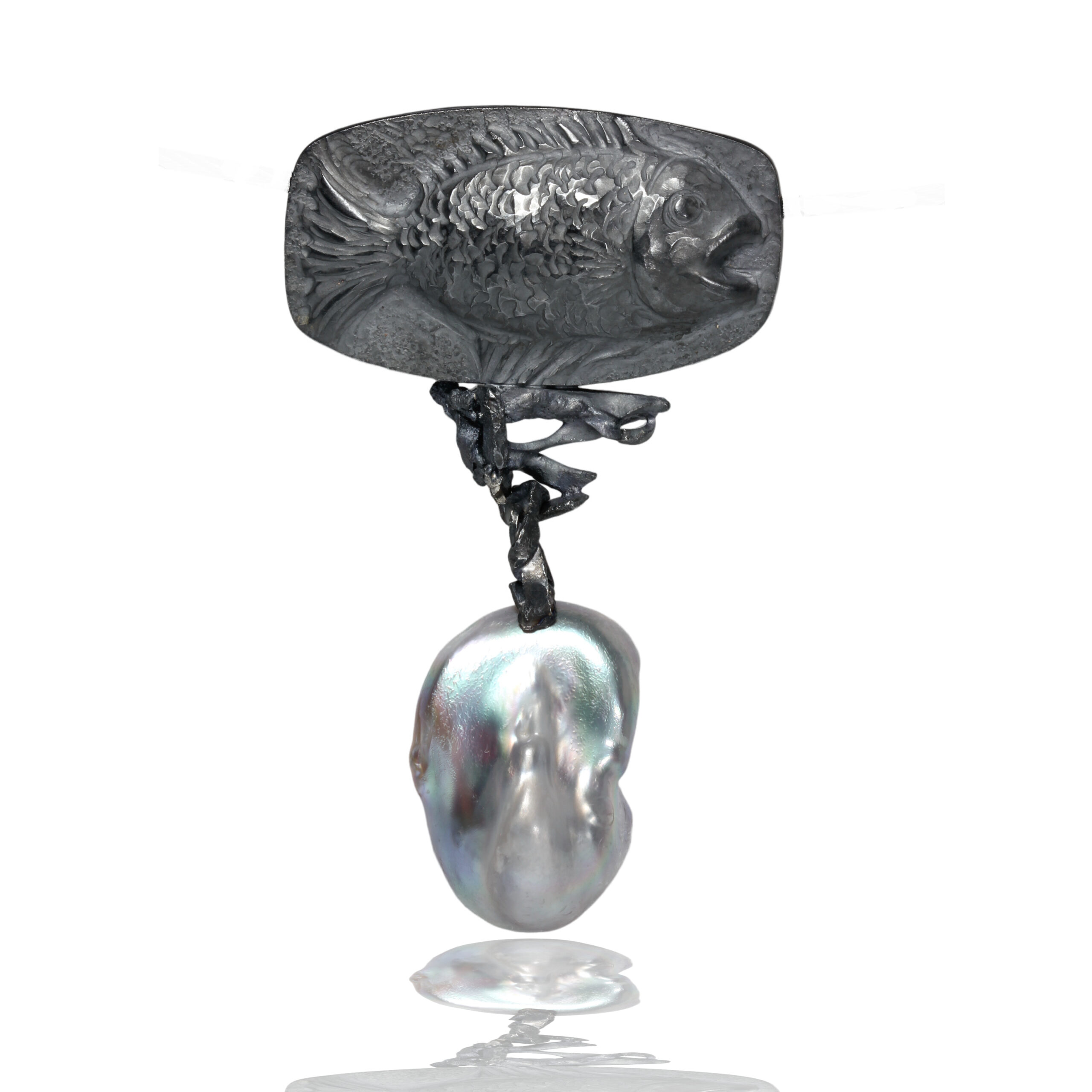 The black patinated repoussé fish is suspending a large gray pearl. The pearl is 25.4 mm x17.4mm.