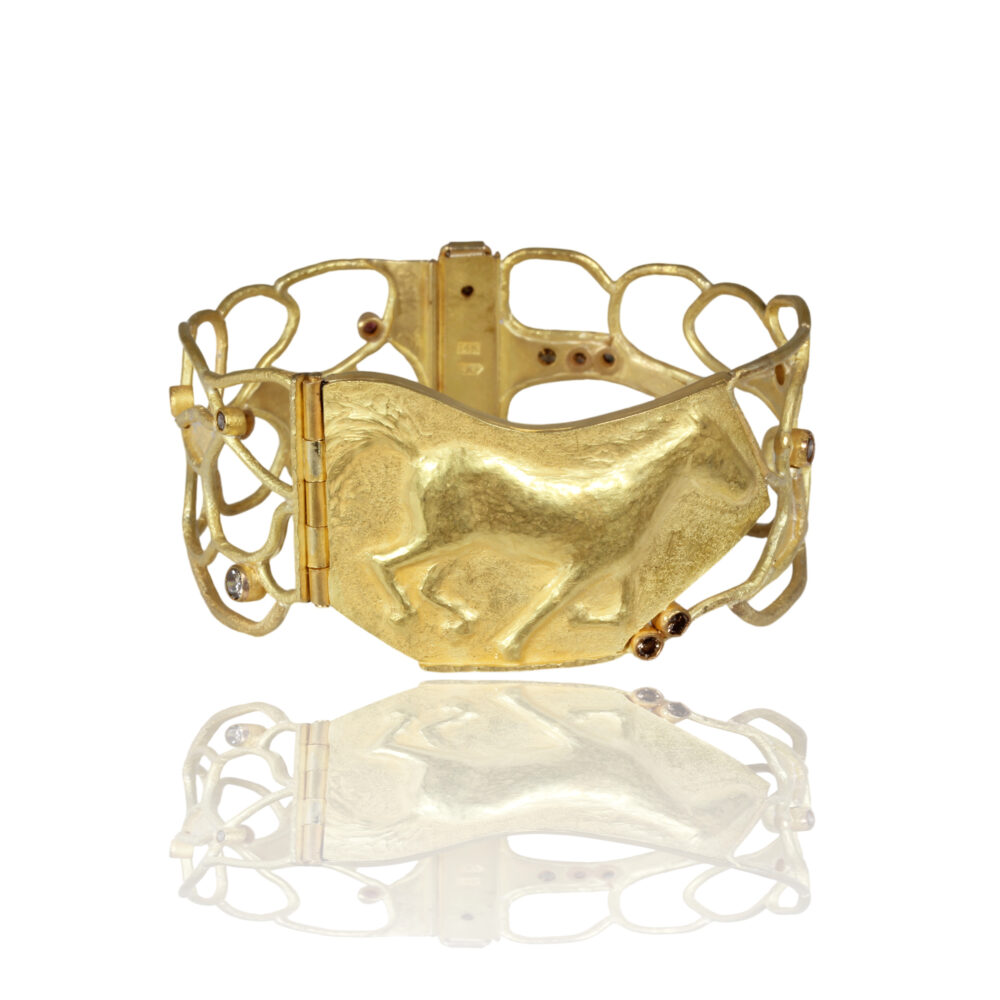 There is a 14k gold strip inbetween the flower and hinge, The clasp is sculpted fused open gold that has yellow sapphires set into it, with an safety clasp at the end There are 2.22ct of yellow sapphires.