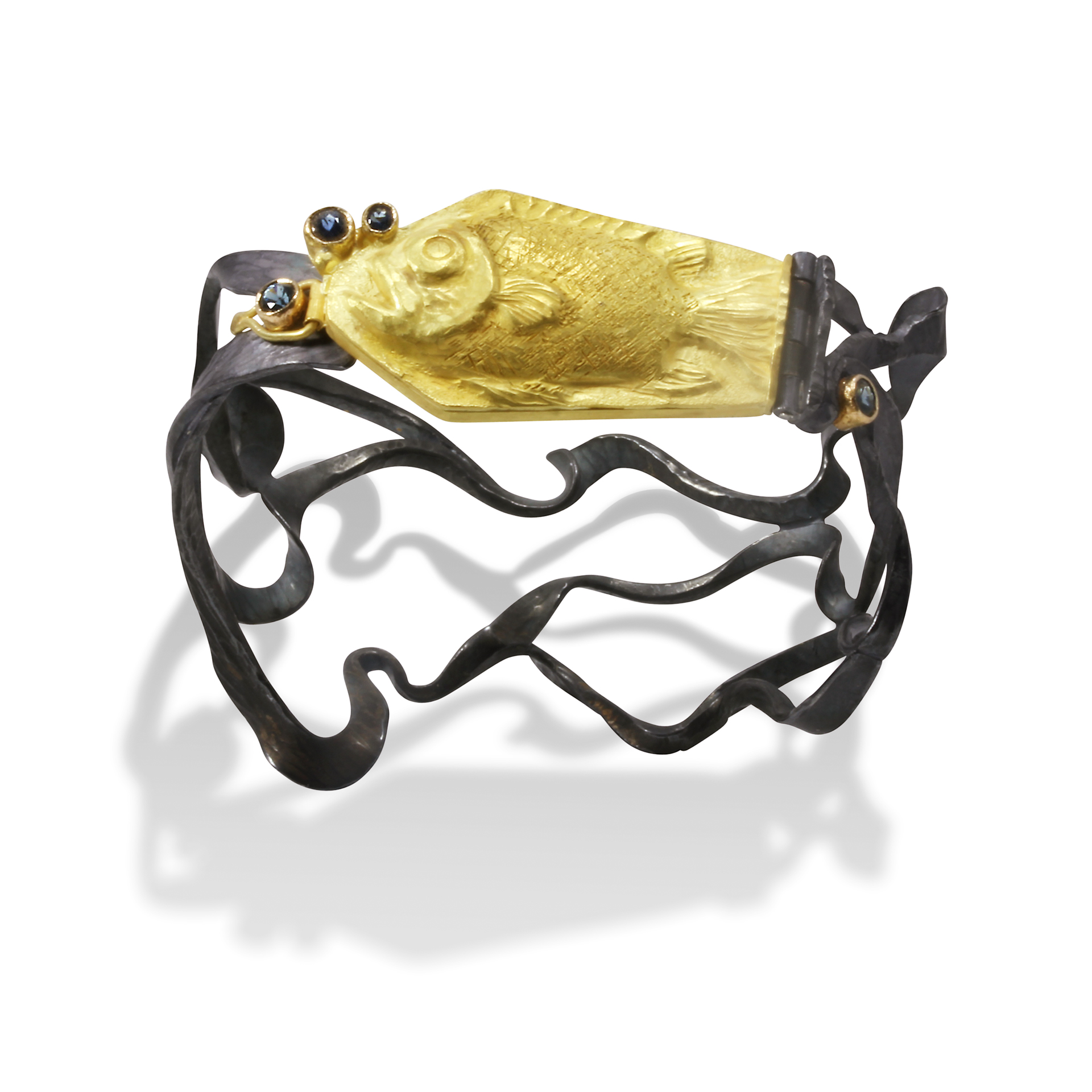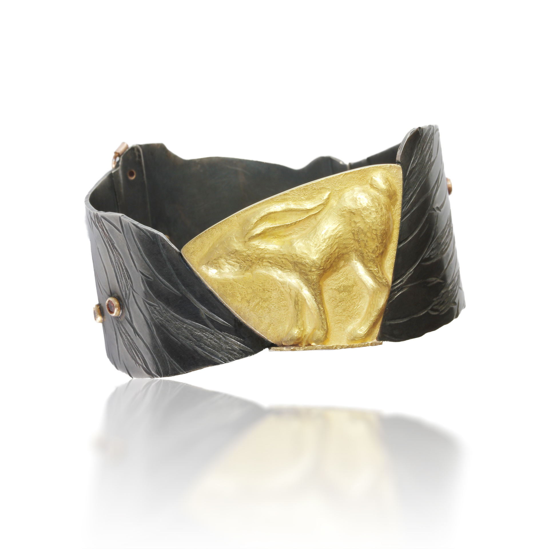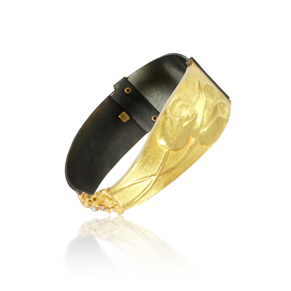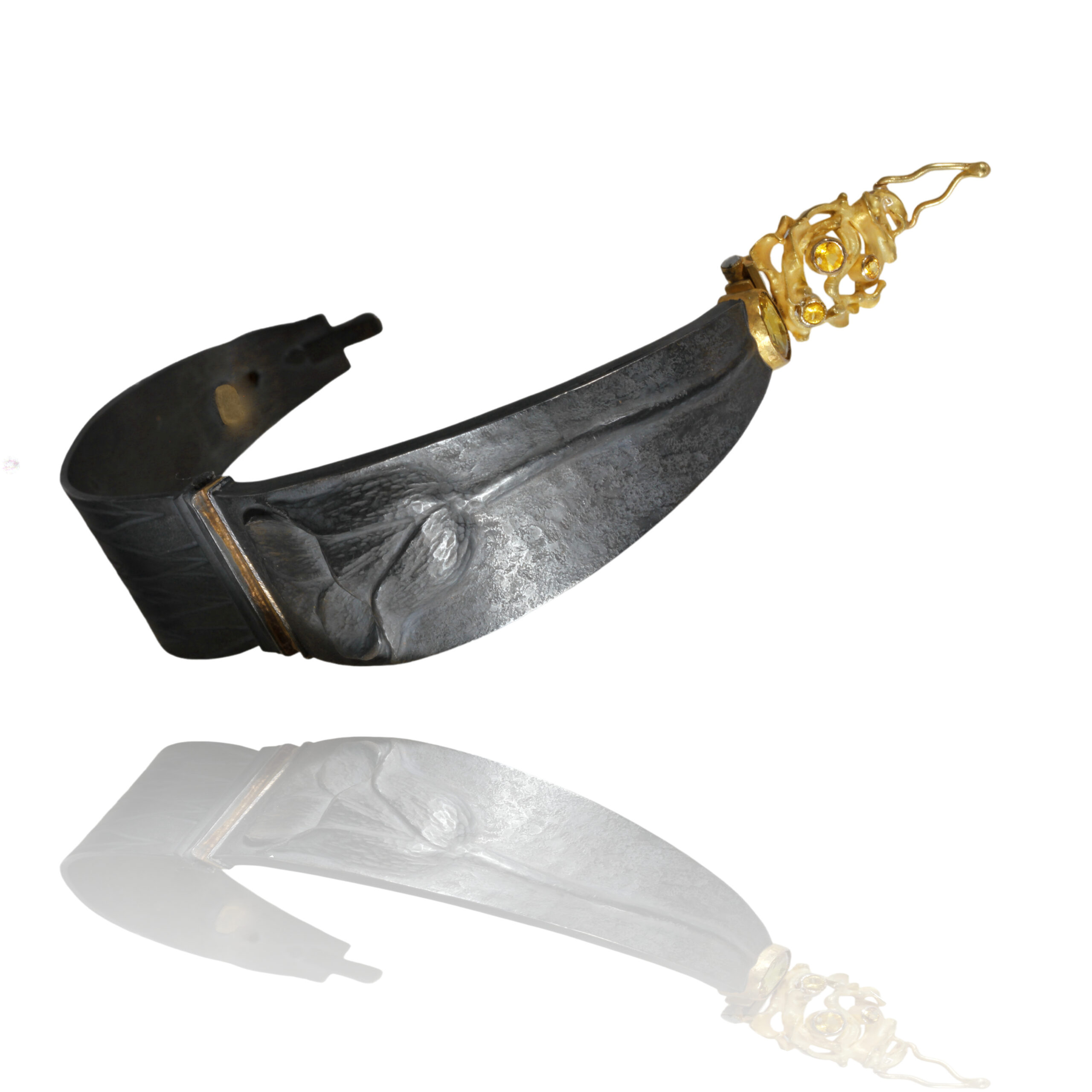 This hinged cuff bracelet has a patinated silver black tulip that wraps around the front , and has an oval yellow sapphire at the end of the stem. The back has a chased textures leaf pattern