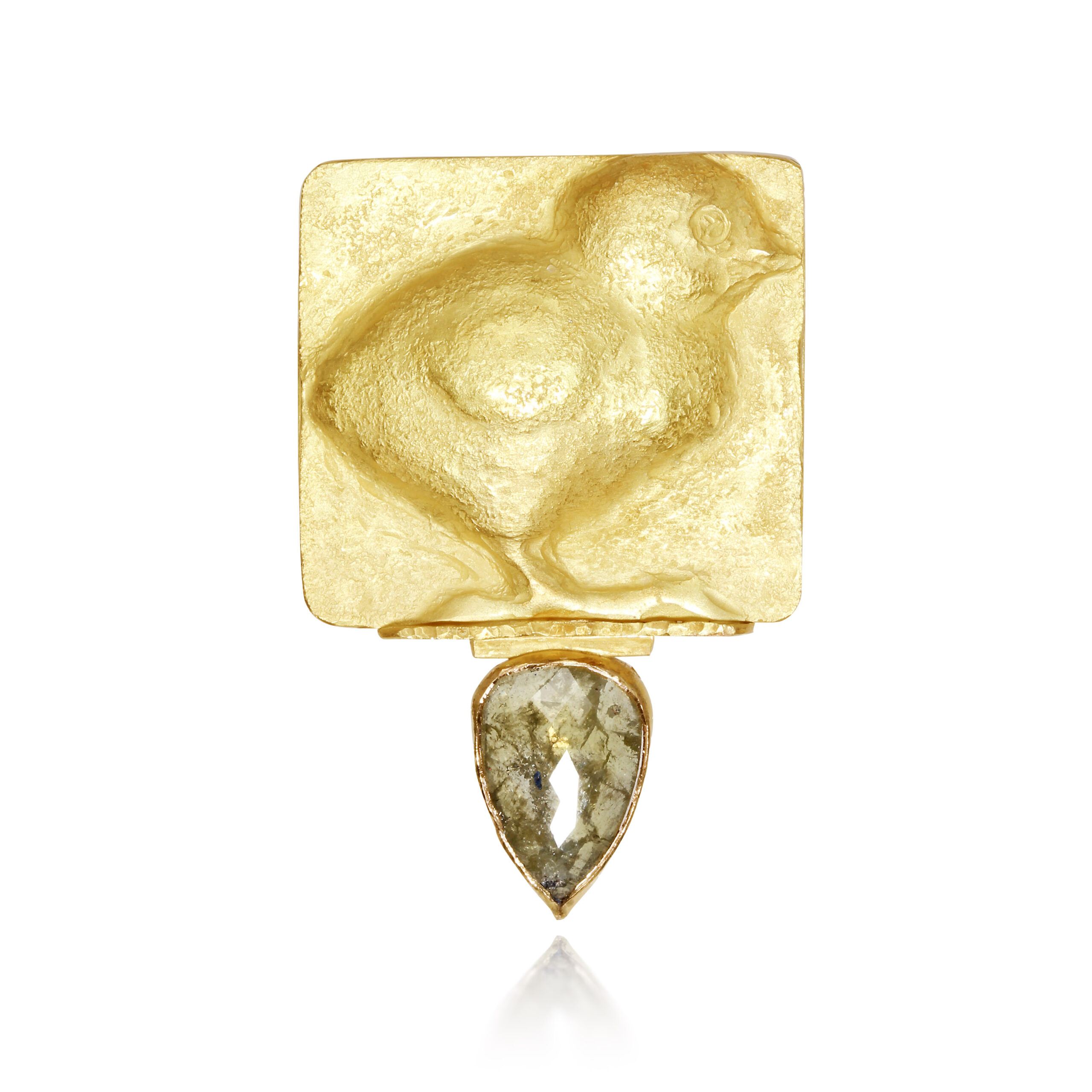 This 14k repoussé pendant is standing on top of a a 1.28 yellow diamond.