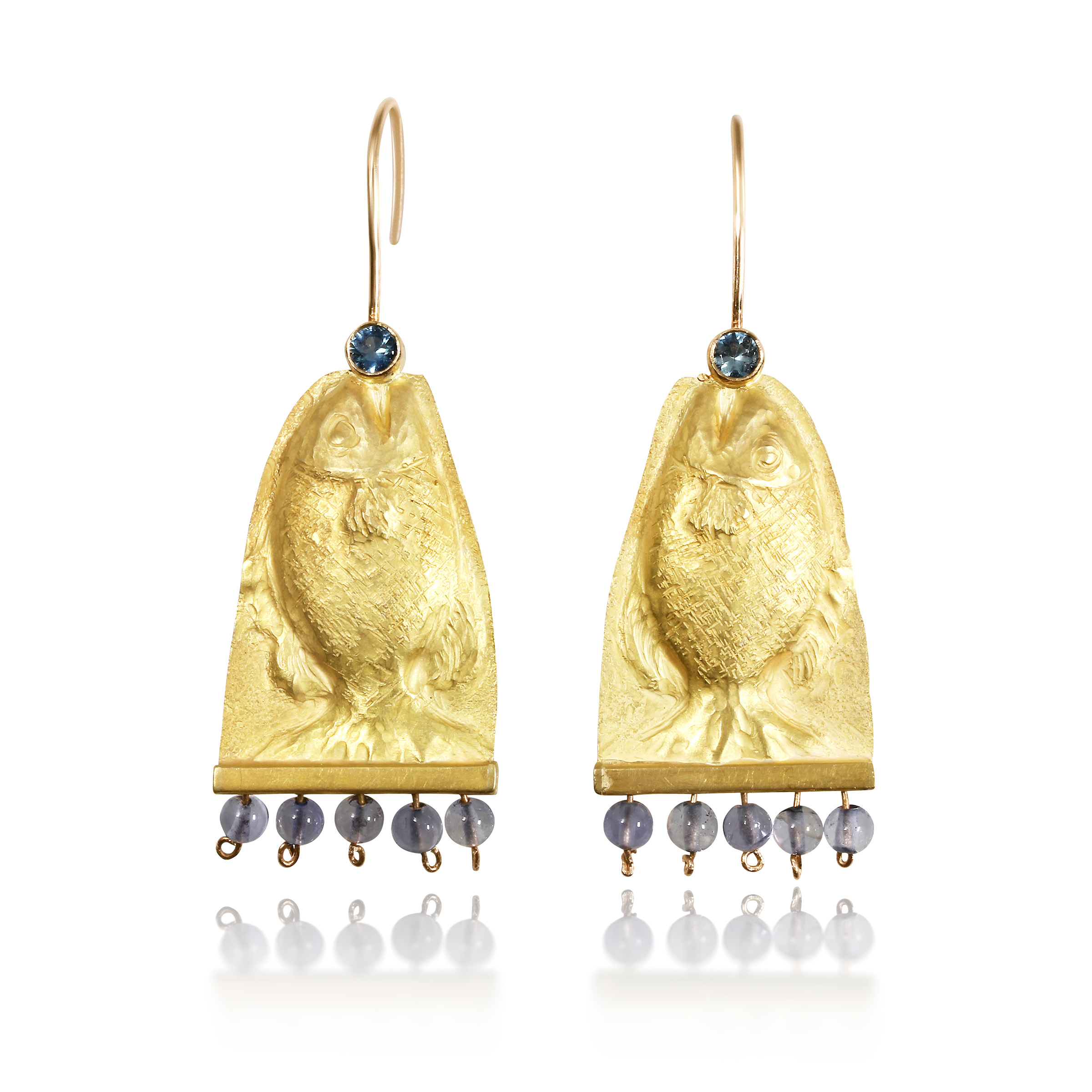 14k repoussé fish earrings have 33pt blue sapphires bubbles on top and with lapsi on the bottom.
