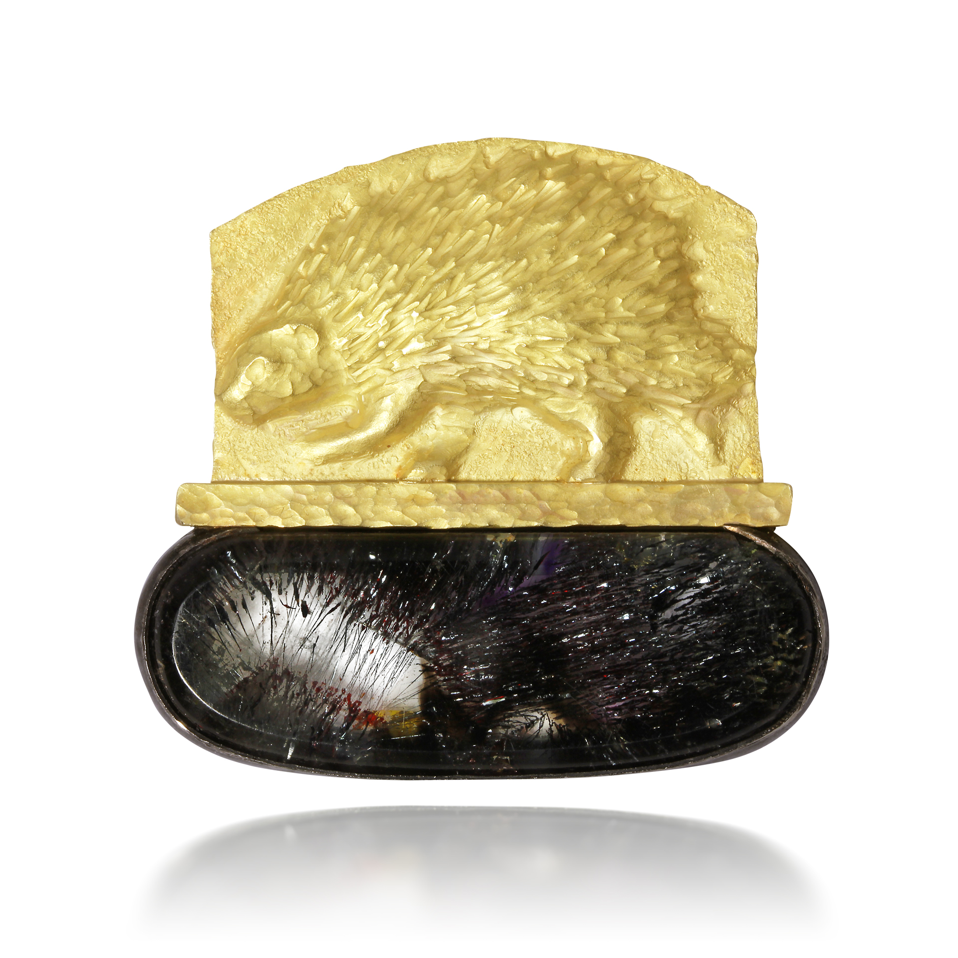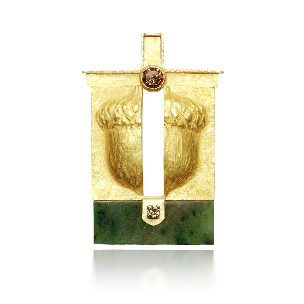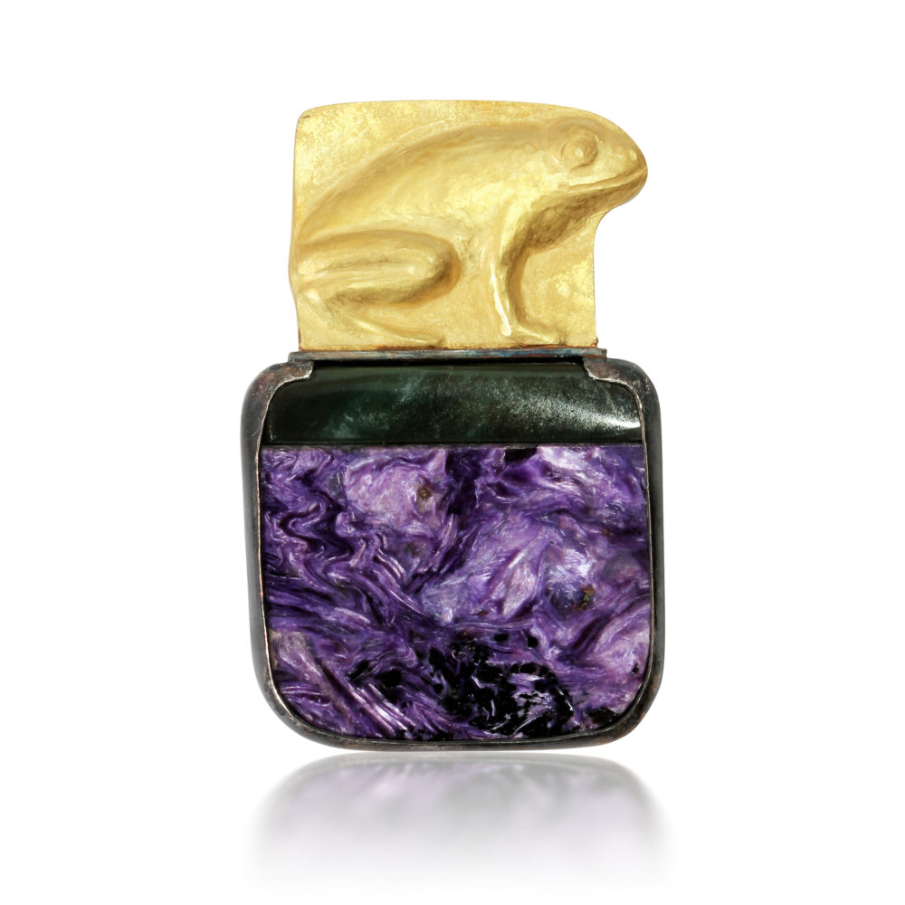 The gold colored frogs are another endangered species. This 14k repoussé gold frog is sitting on dark jade green ground by a purple charoite pond, the stones are set in patinated silver.