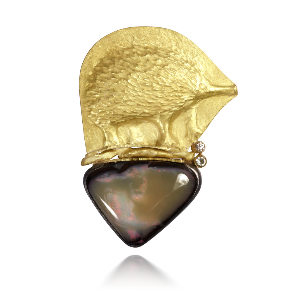 This little nocturnal primate lives on islands in south Asia. My 14k repoussé tarsier is holding on for dear life on a branch of chrysoprase, which is the top part of a 2 part brooch. The bottom brooch’s ocean jasper is set in patinated silver, and represents the rich colors of the forest, the chrysoprase here is set in gold.