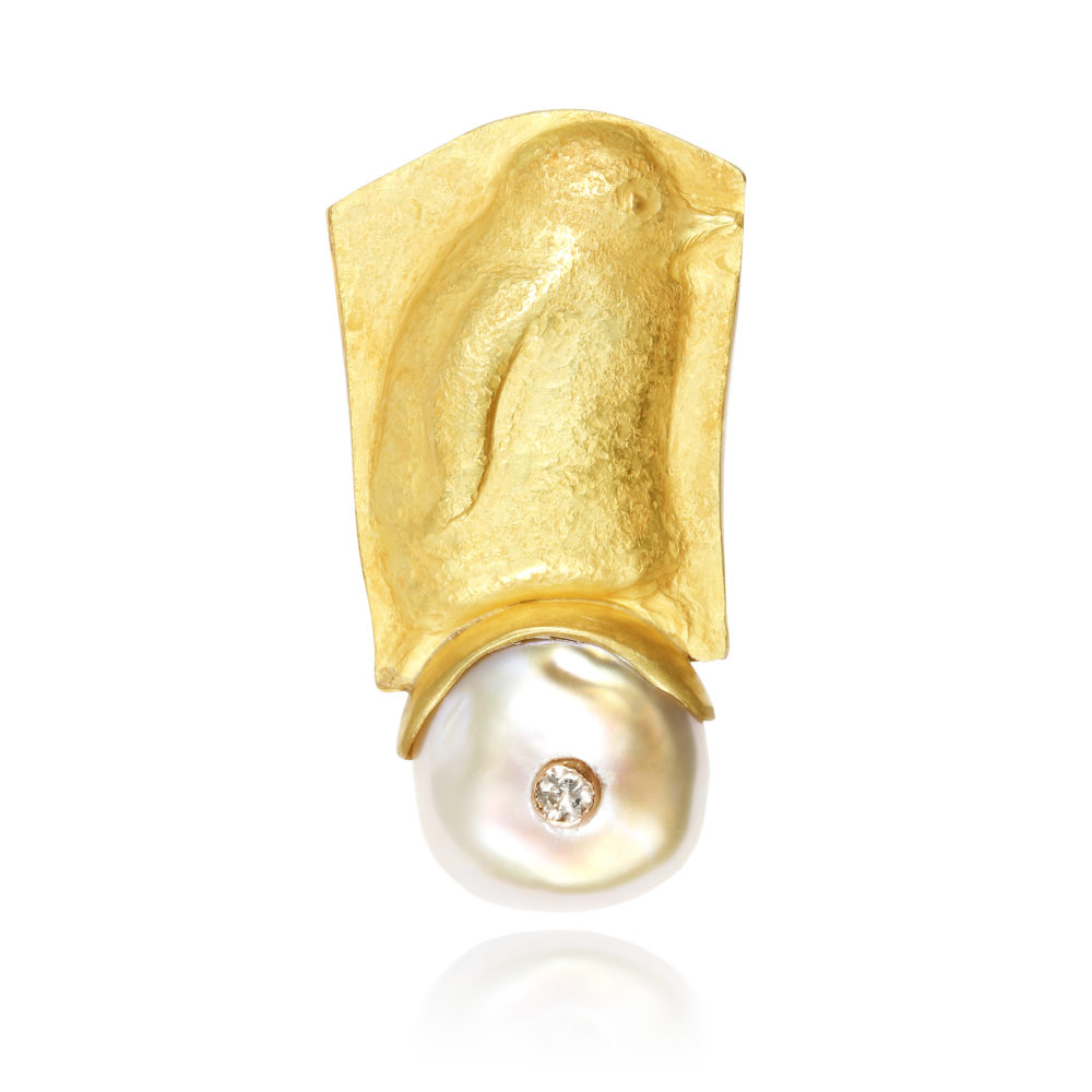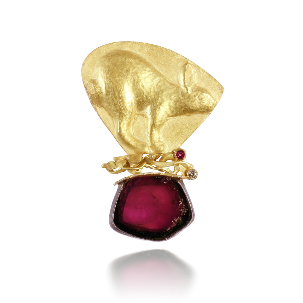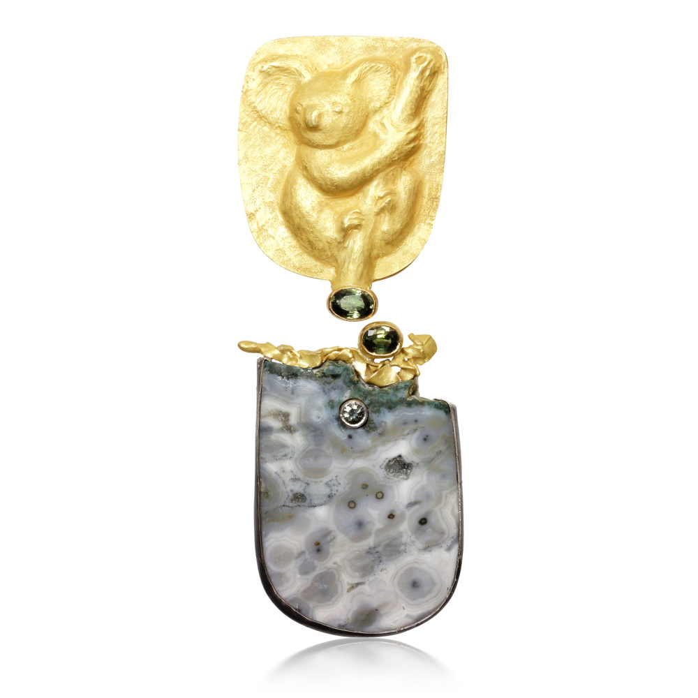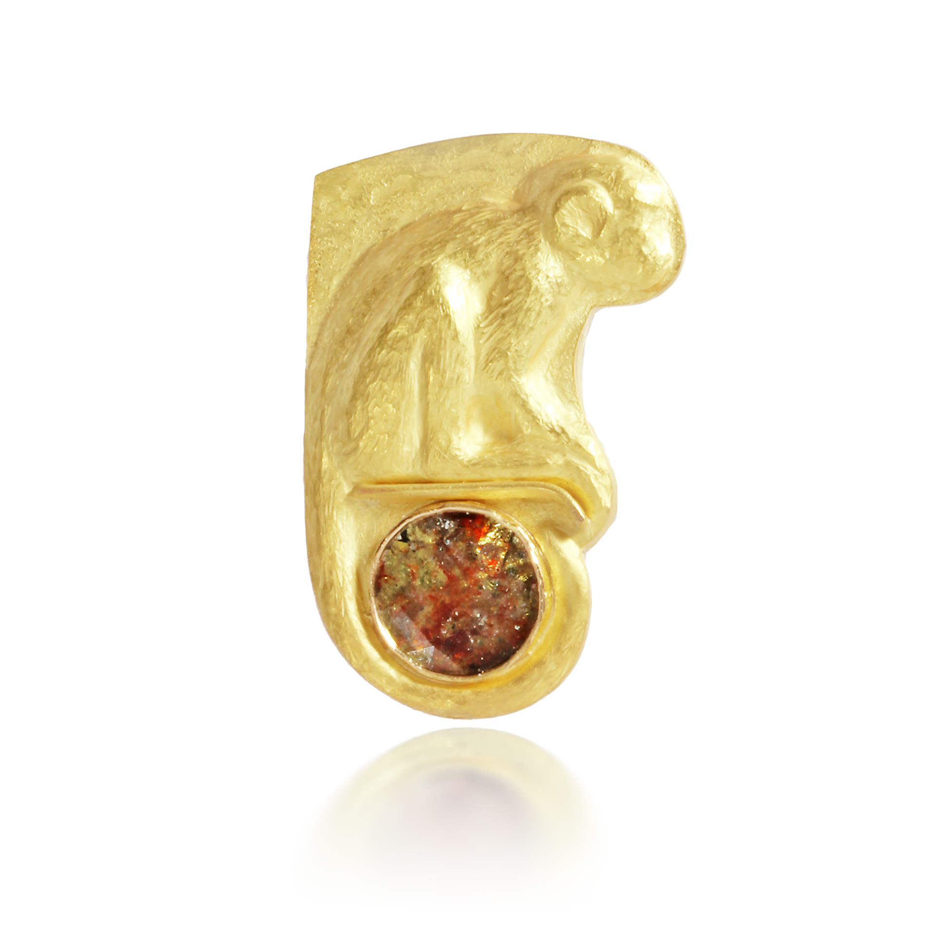 This little 14k repoussé squirrel monkey is sitting on a round diamond branch. The diamond is a 1.66ct diamond slice.