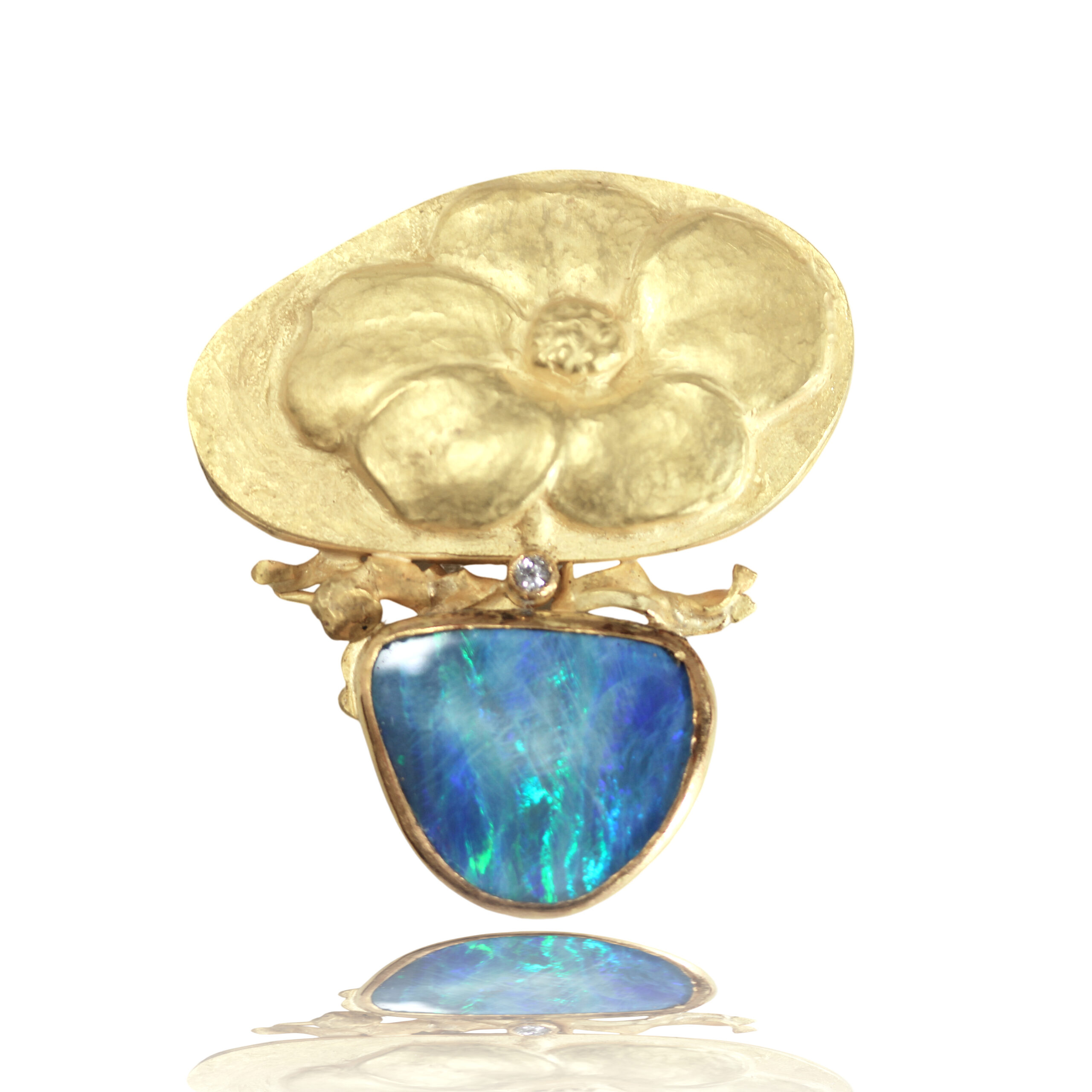 The 14k repoussé flower is on top textured gold sculpted form that has a 5pt diamond in the center. There is an opal doublet that is set in gold underneath.