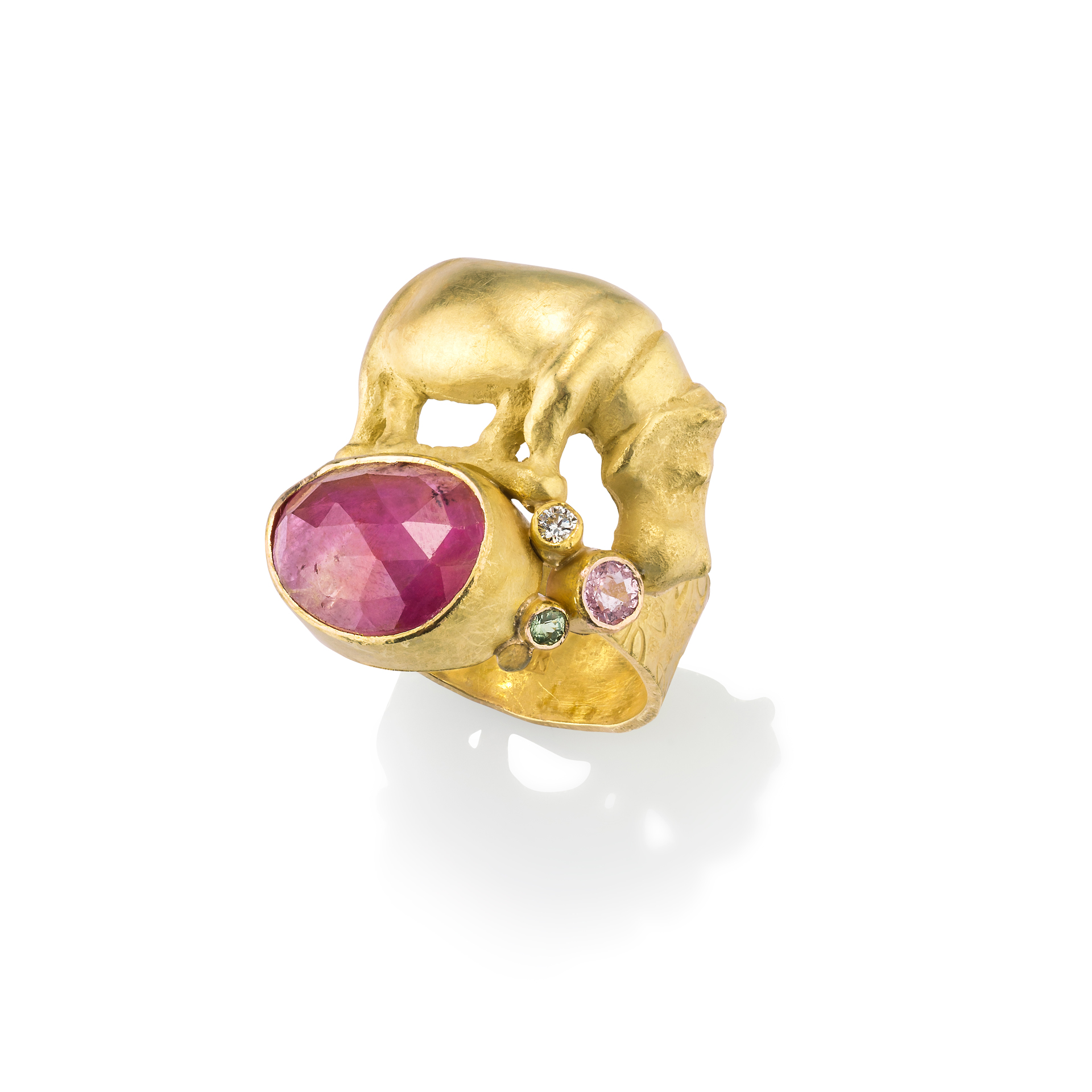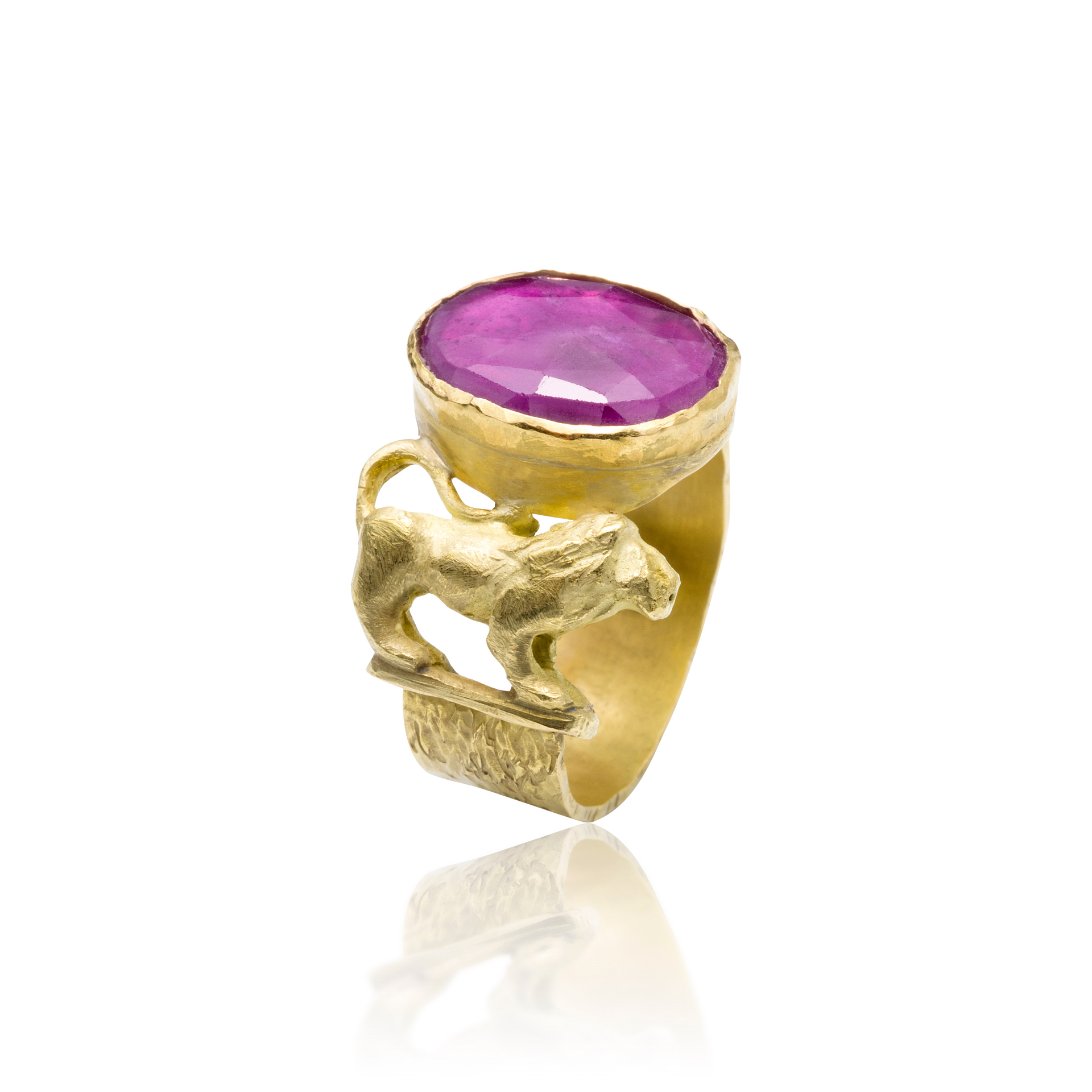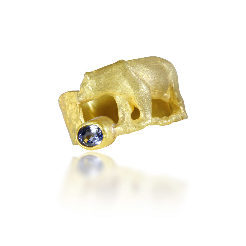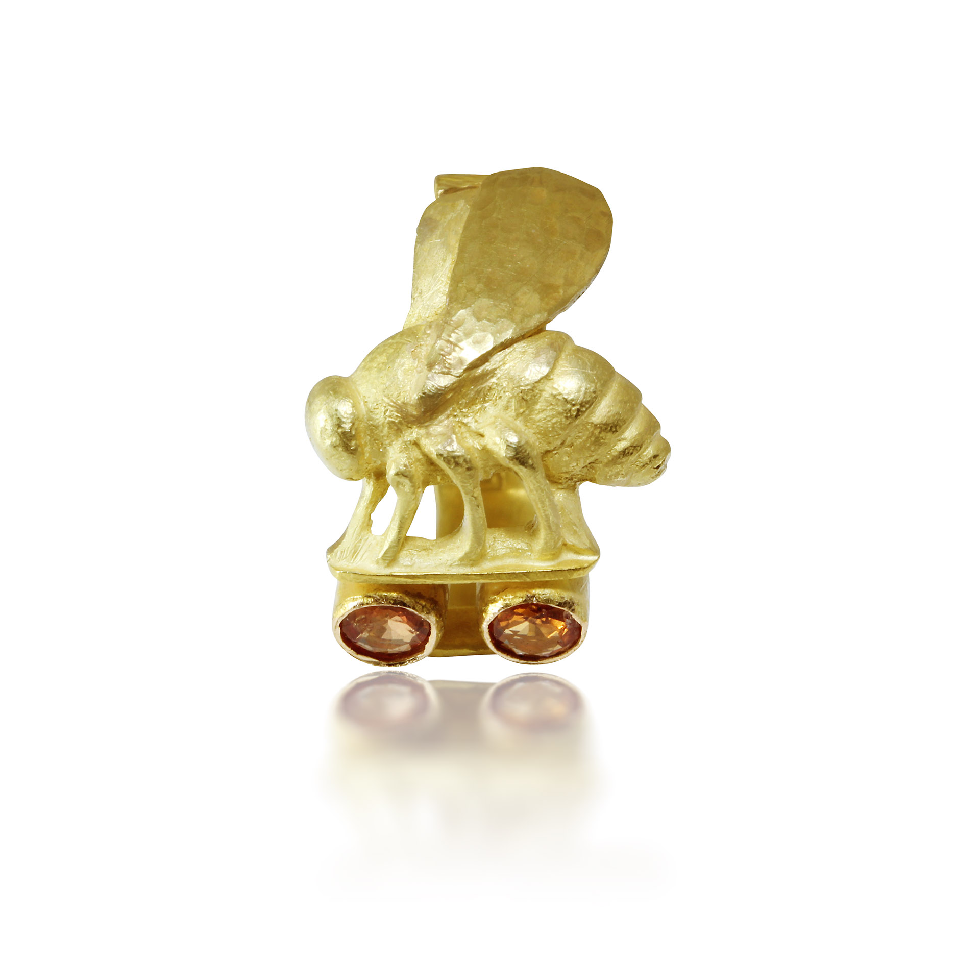 The bee ring is made of 14k gold. the bee is standing on 2 honey colored sapphires, 51pt.