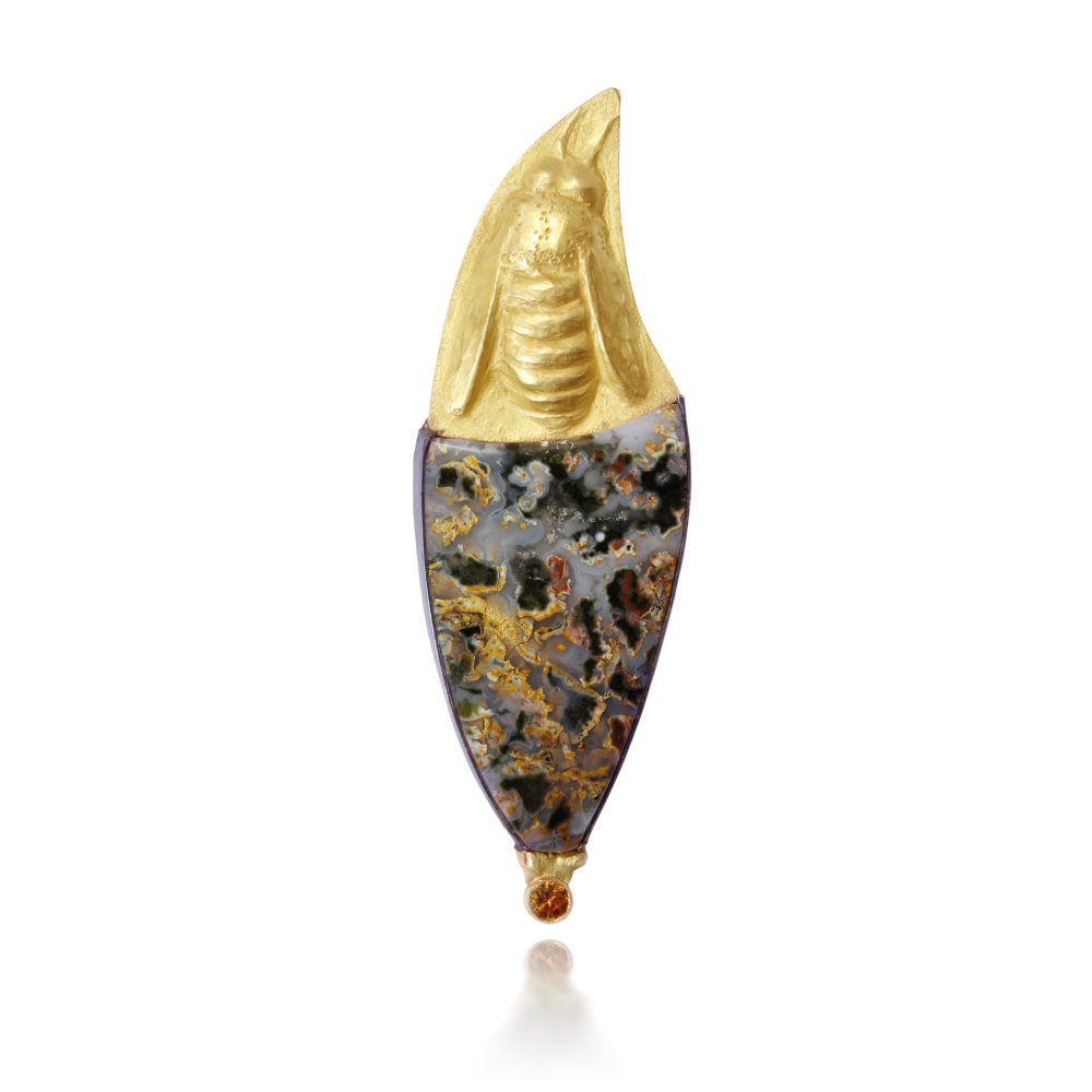 A 14k repoussé porcupine is walking on an unusual stone that has crystal spikes in it.