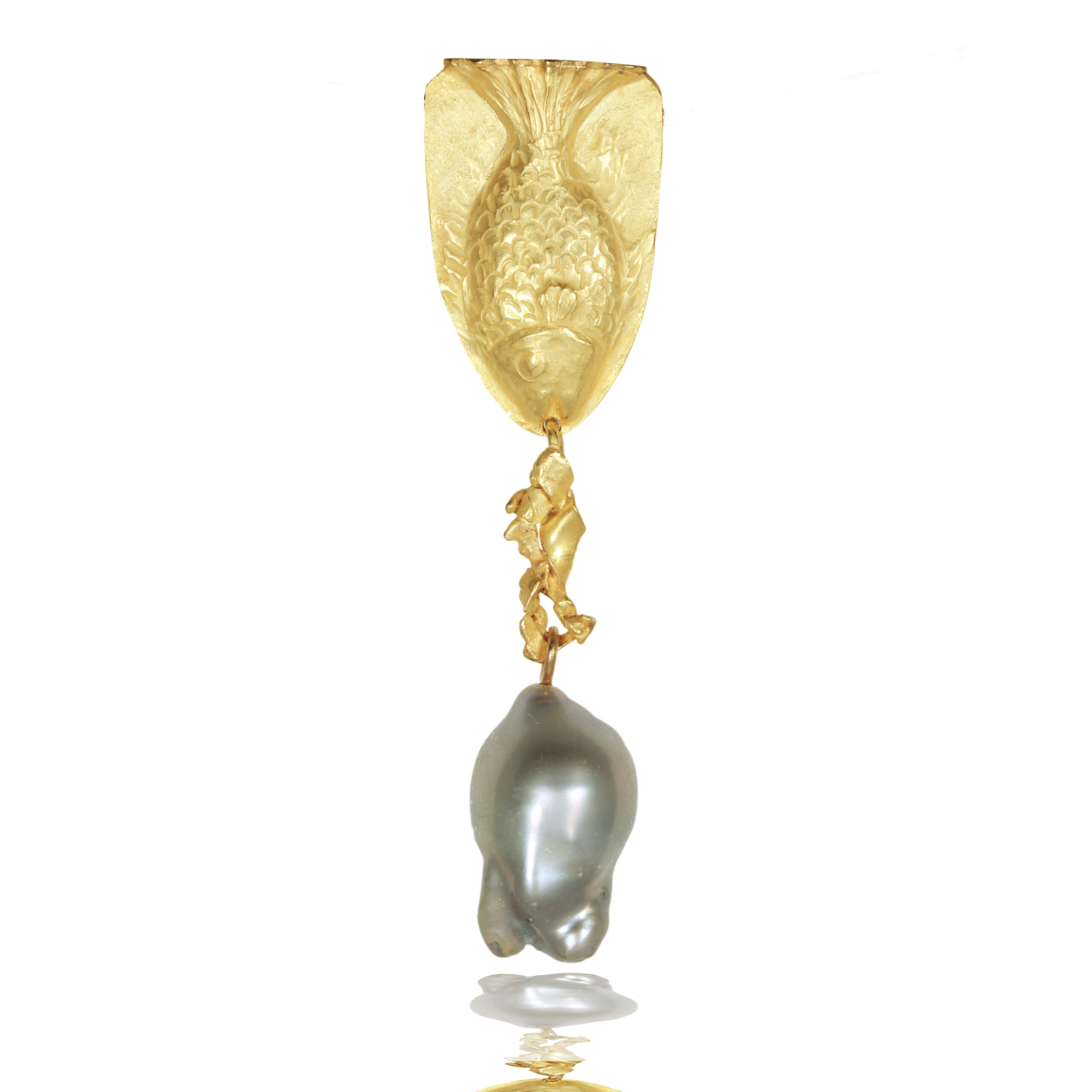The 14k repoussé fish is holding a twisted line and grey pearl fish in this pendant. The pearl is 25.3mmx15.6mm
