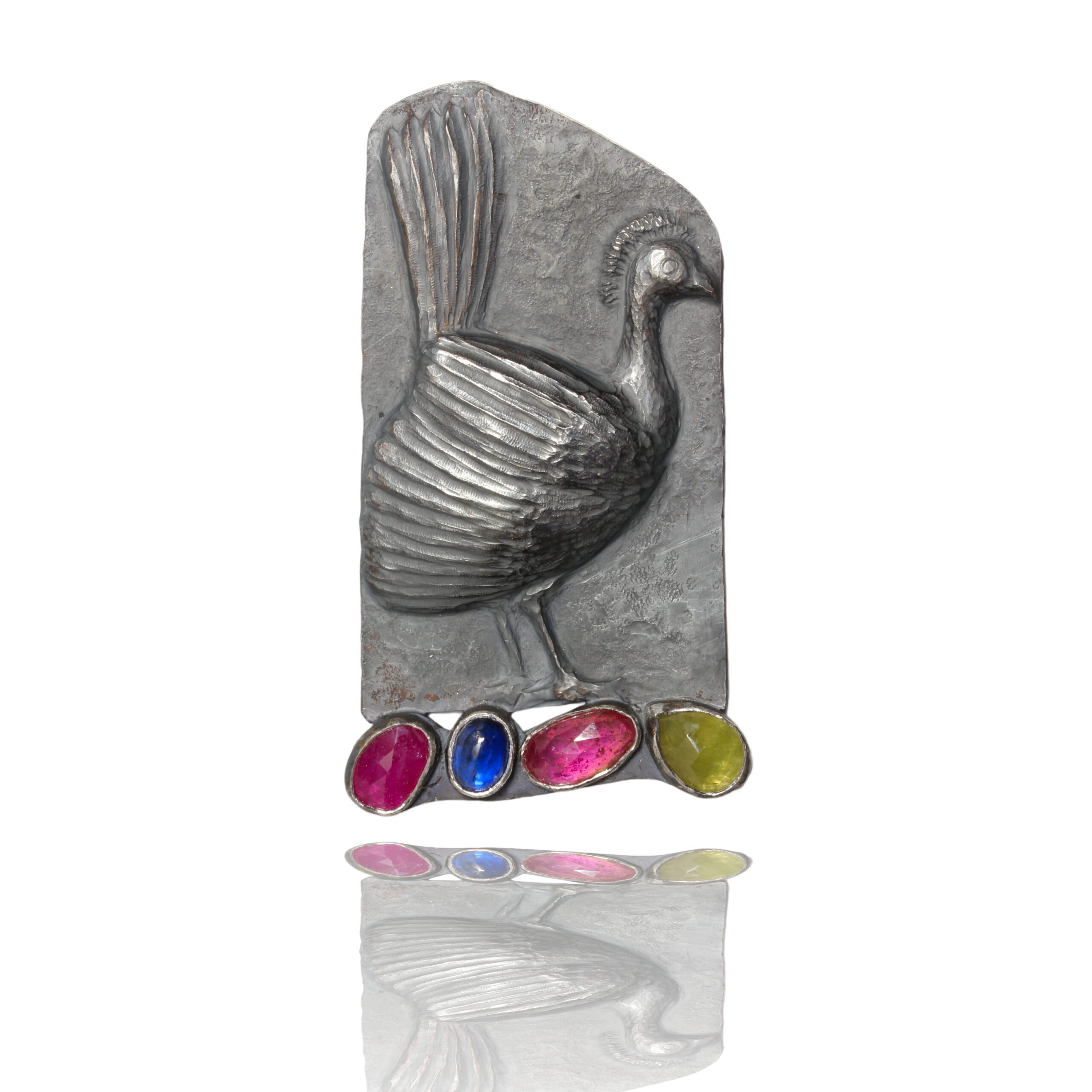 The Great Carasow lives in the Mexican and Equador area.This sterling silver repoussé brooch/pendant has 4 stones that represent the wonderful colors of this endangered bird., the yellow green sapphire is 2.26 ct ,the red sapphire is 2.79 ct, the blue kynite is 2.11 ct and the ruby at the end is 2.05 ct