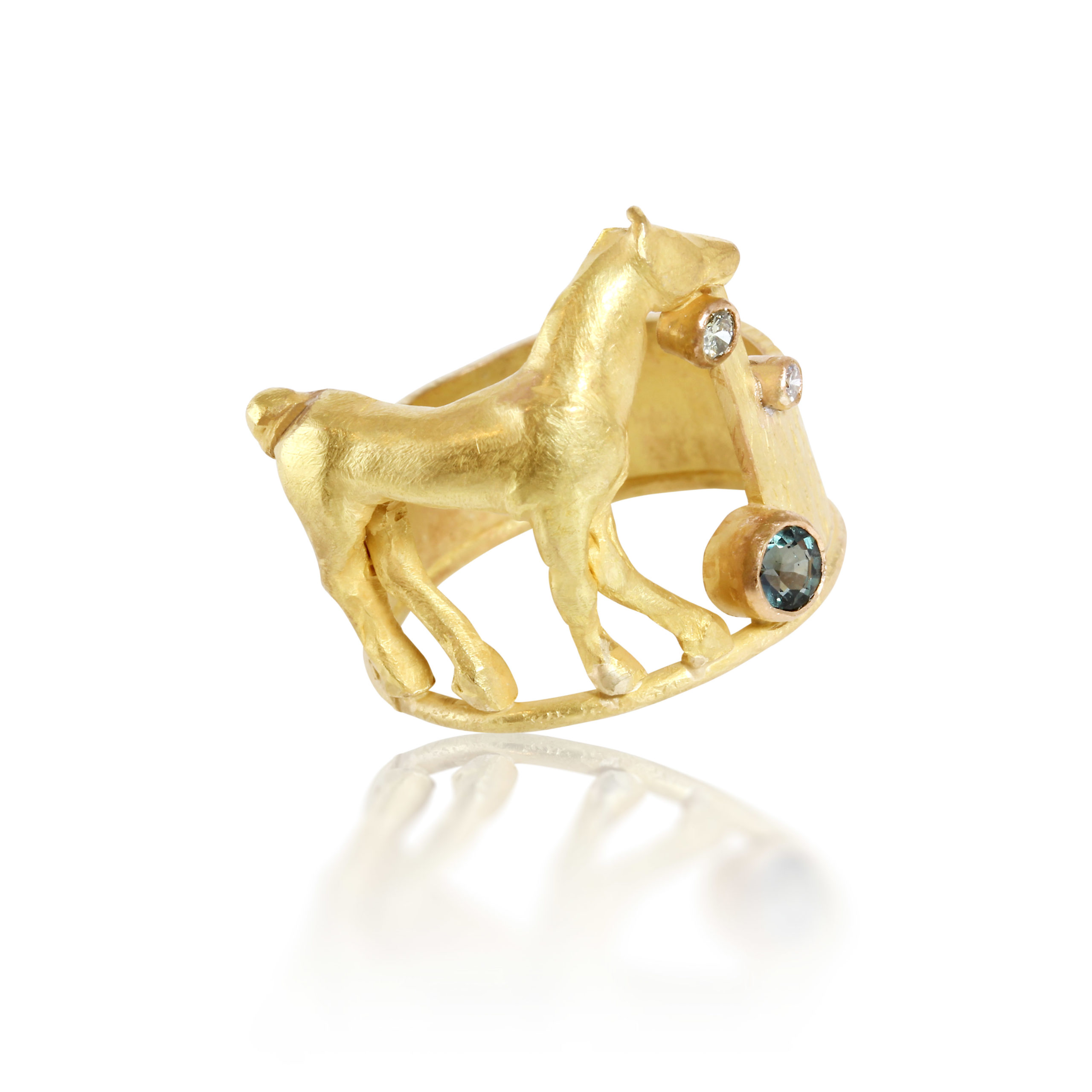 The 14k horse is by a post with a 37pt blue sapphire . The band of the ring is all hand chased.