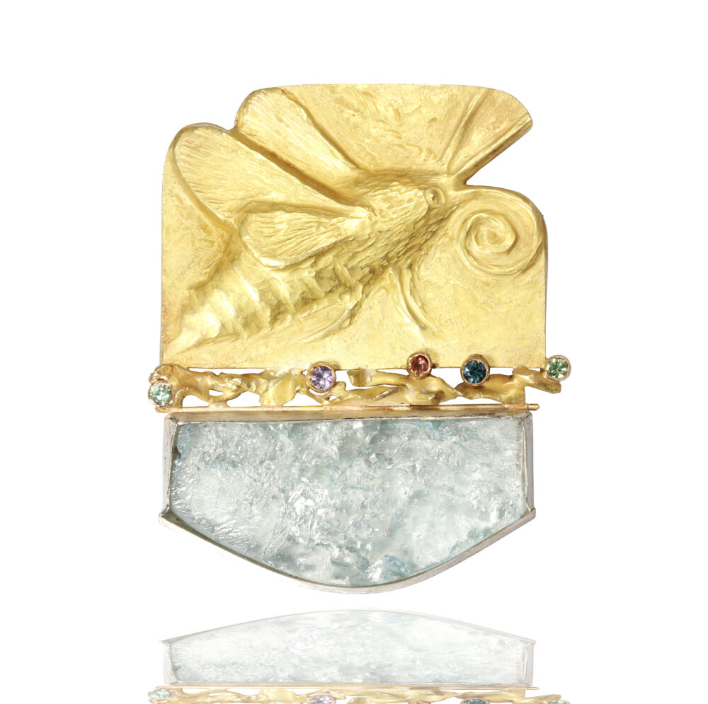 This brooch/pendant is 14k repoussé hummingbird on top of an open fused textural section that has 5 sapphires. The bottom stone is a 31.71ct natural surfaced aquamarine crystal which is set in silver.