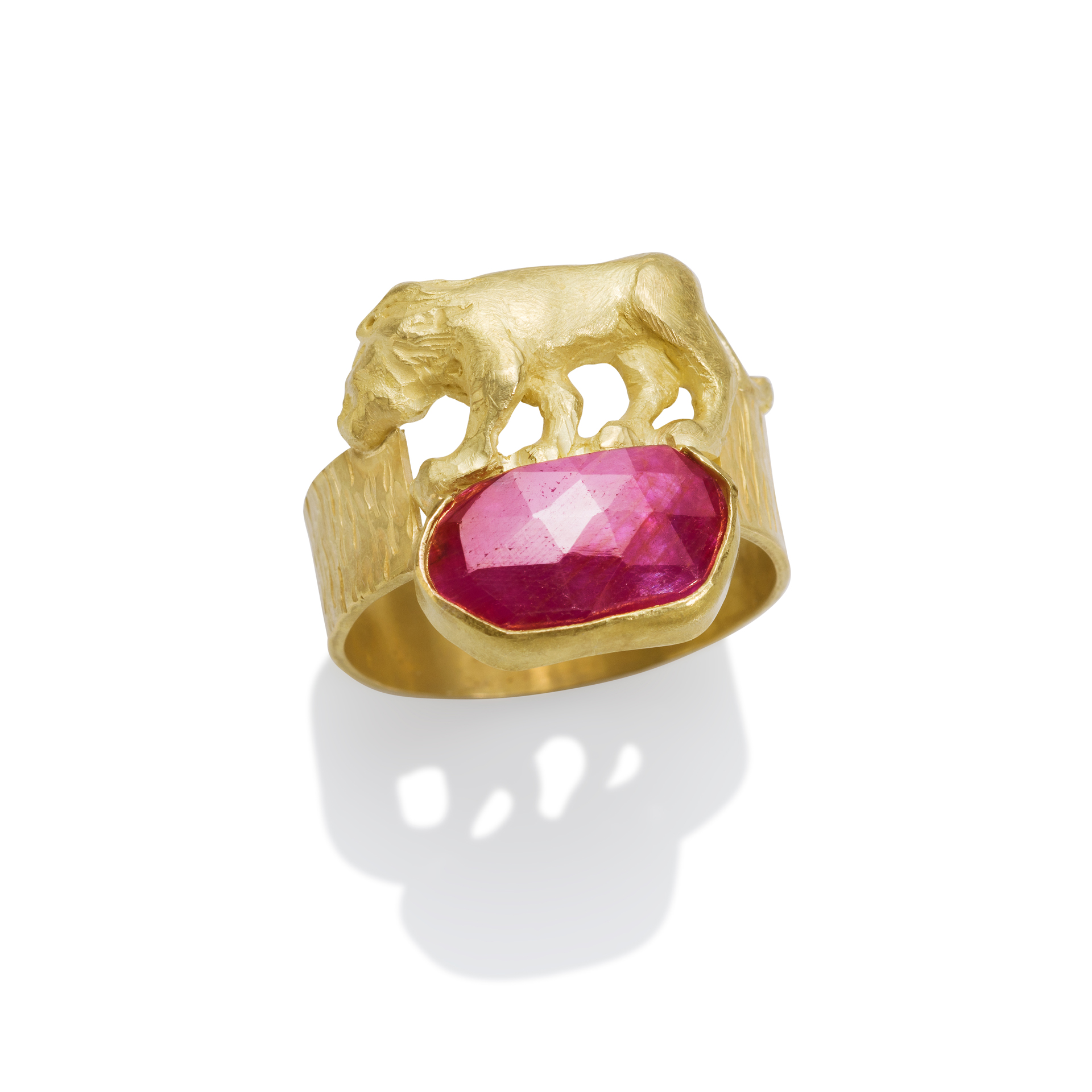 Lion is set with an irregular shaped 3.6ct ruby. The band is an all over hand chased pattern.