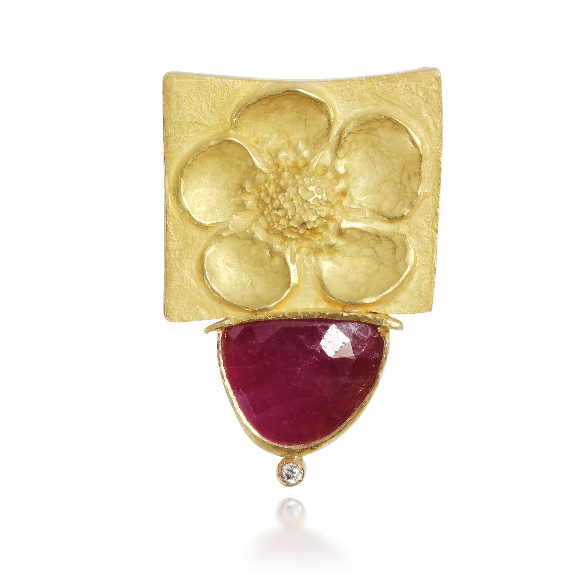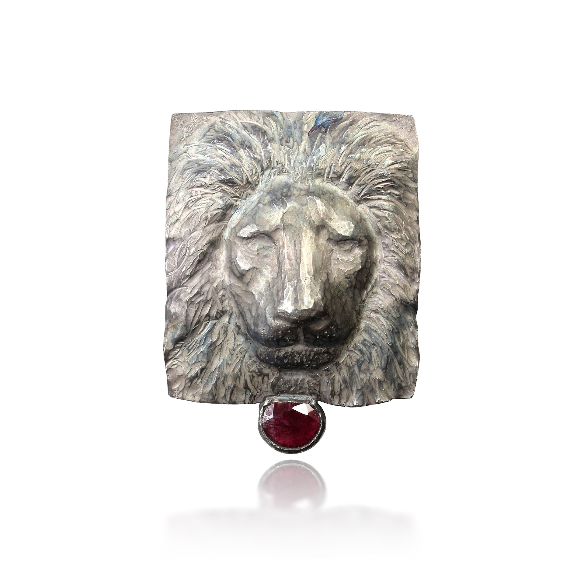 The pendant is a patinated silver repoussé lions head with a 1.39ct ruby on the bottom.