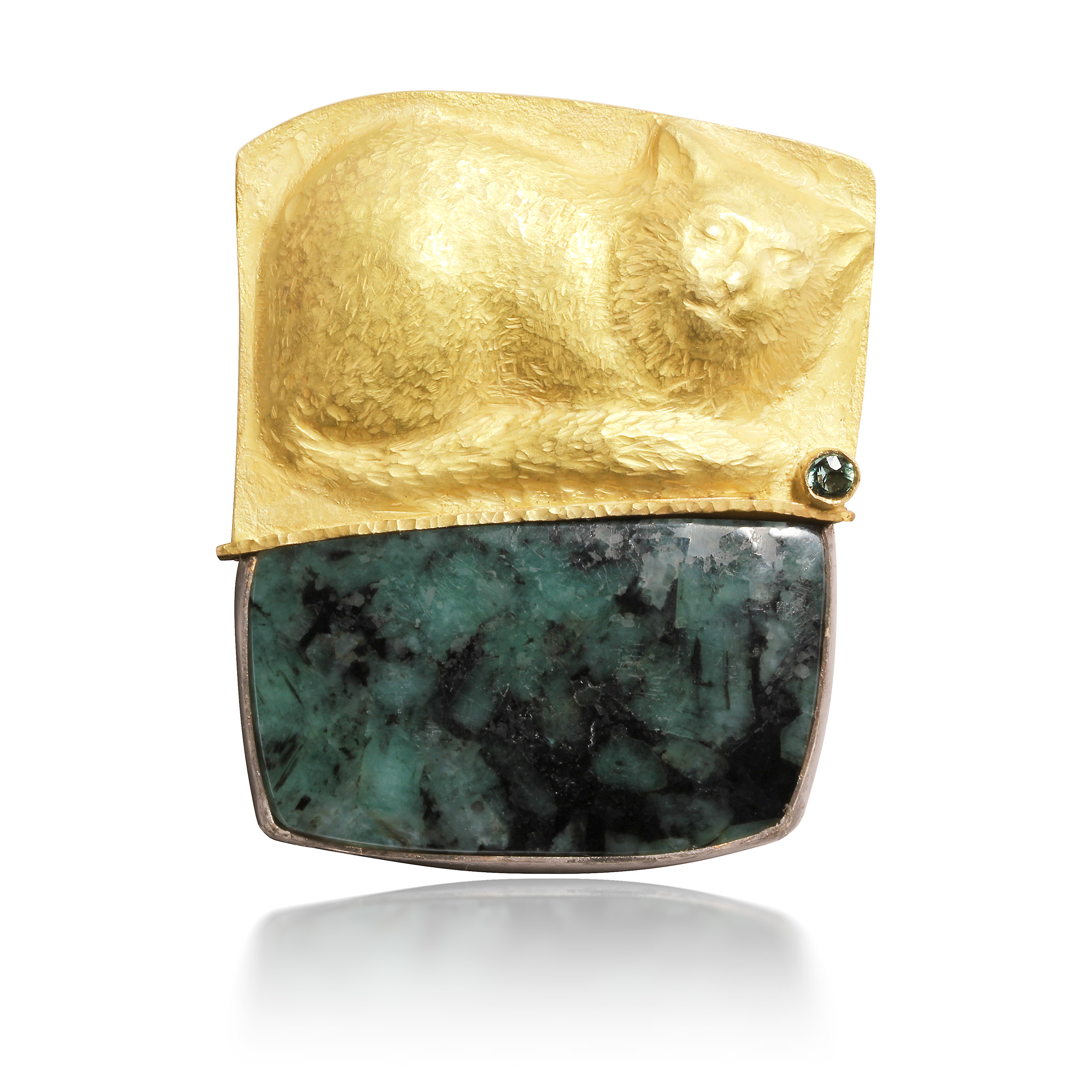 This brooch/ pendant is of a pallas cat which is endangered. It iis know to be grumpy. The 14k repoussé catis sitting on top of green beryl, there is a faceted green sapphire set of to the side.