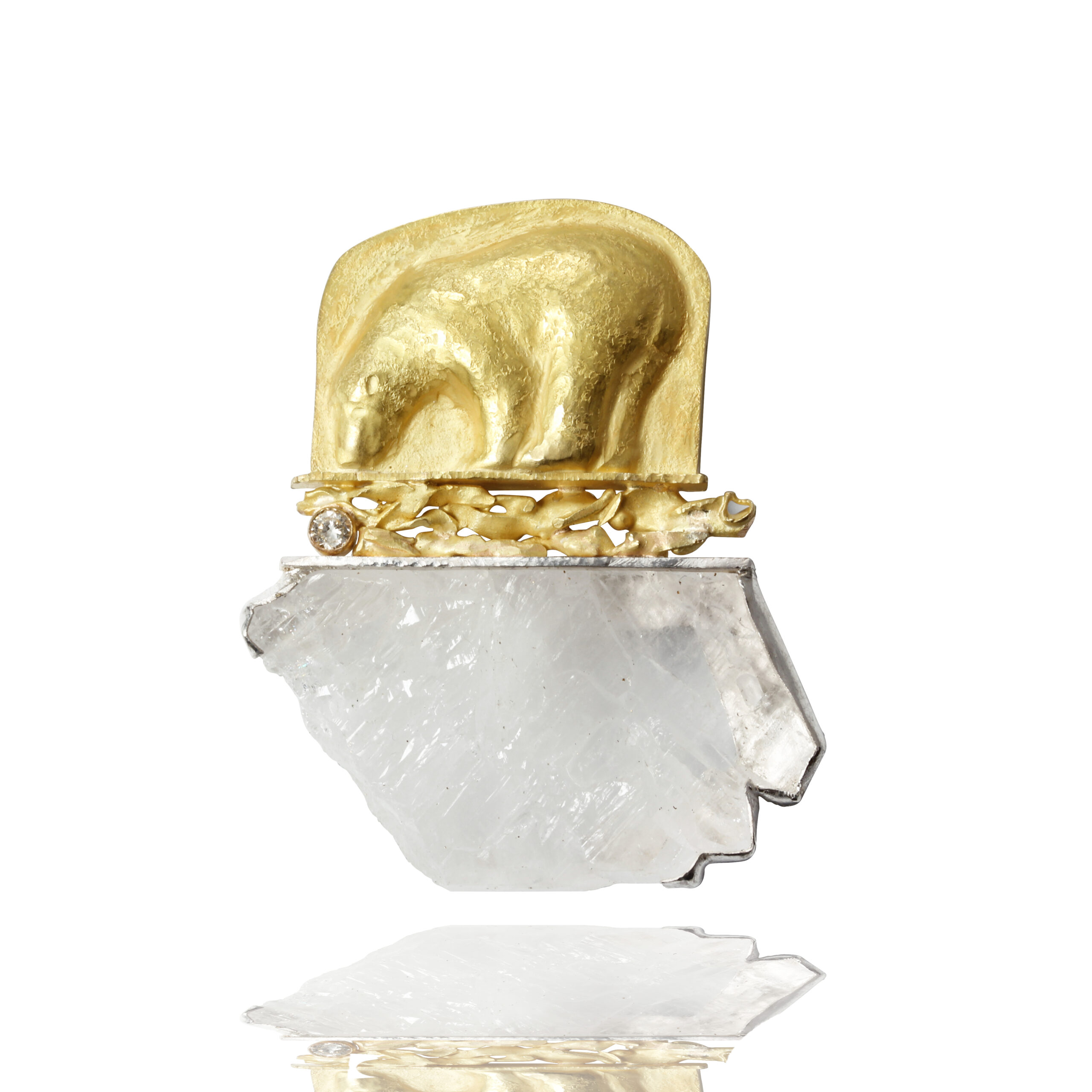 This 14k brooch/pendant is of a little polar bear cub, which is an endangered species. It is standing and looking down to an 11pt sparkling piece of ice( diamond). The large ice on the bottom is a natural quartz crystal formation which is set in silver.