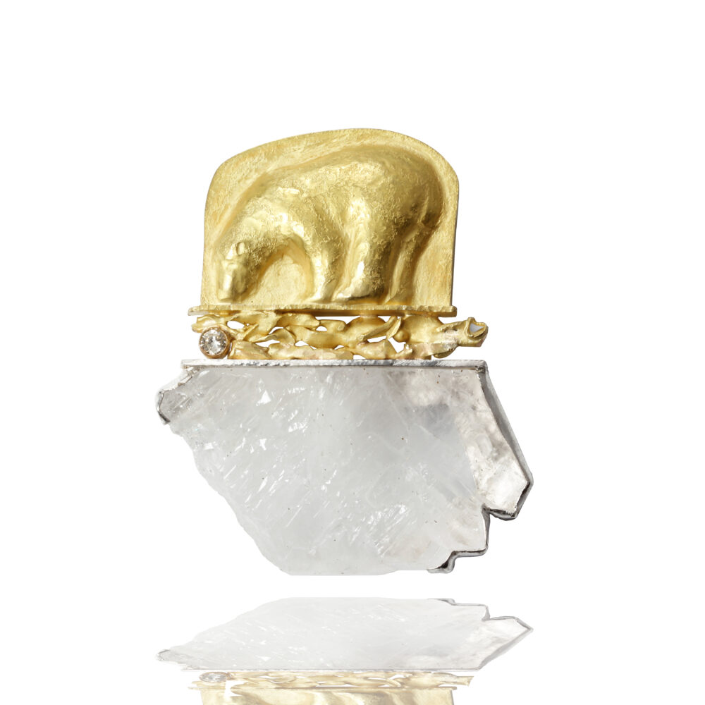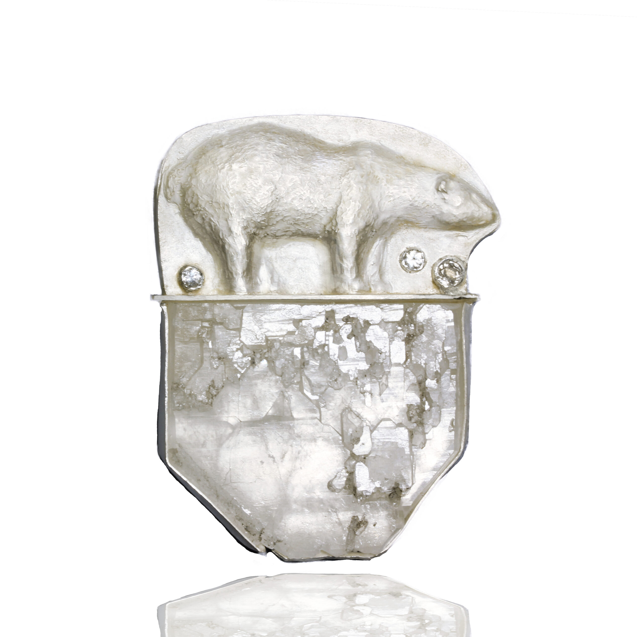 The polar Bear is a silver repoussé brooch/pendant. It has 3 clear sapphires 49pt. and a natural surface quartz crystal.
