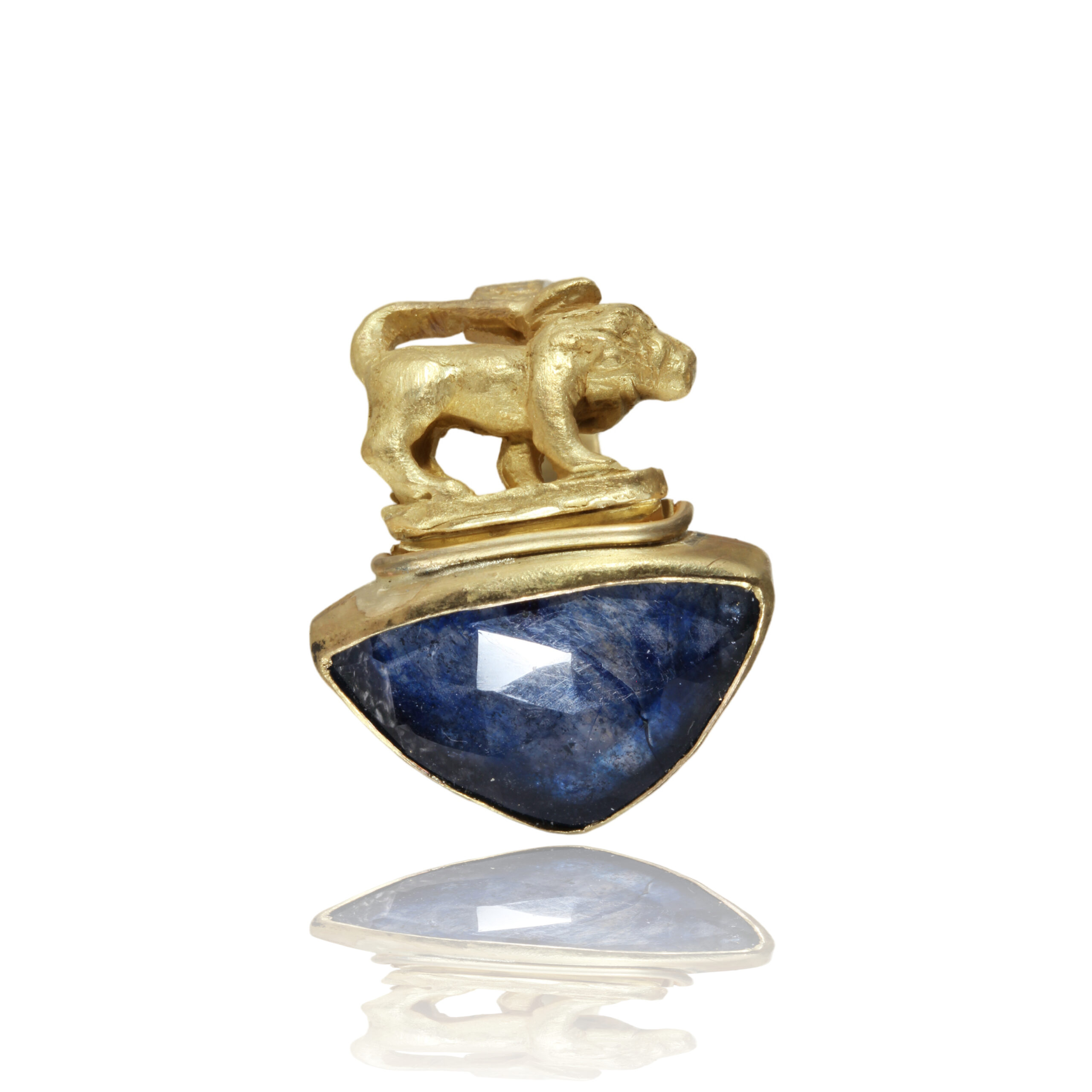 The lion ring is 14k and 18k with low rose cut blue sapphire which is 8.1ct.