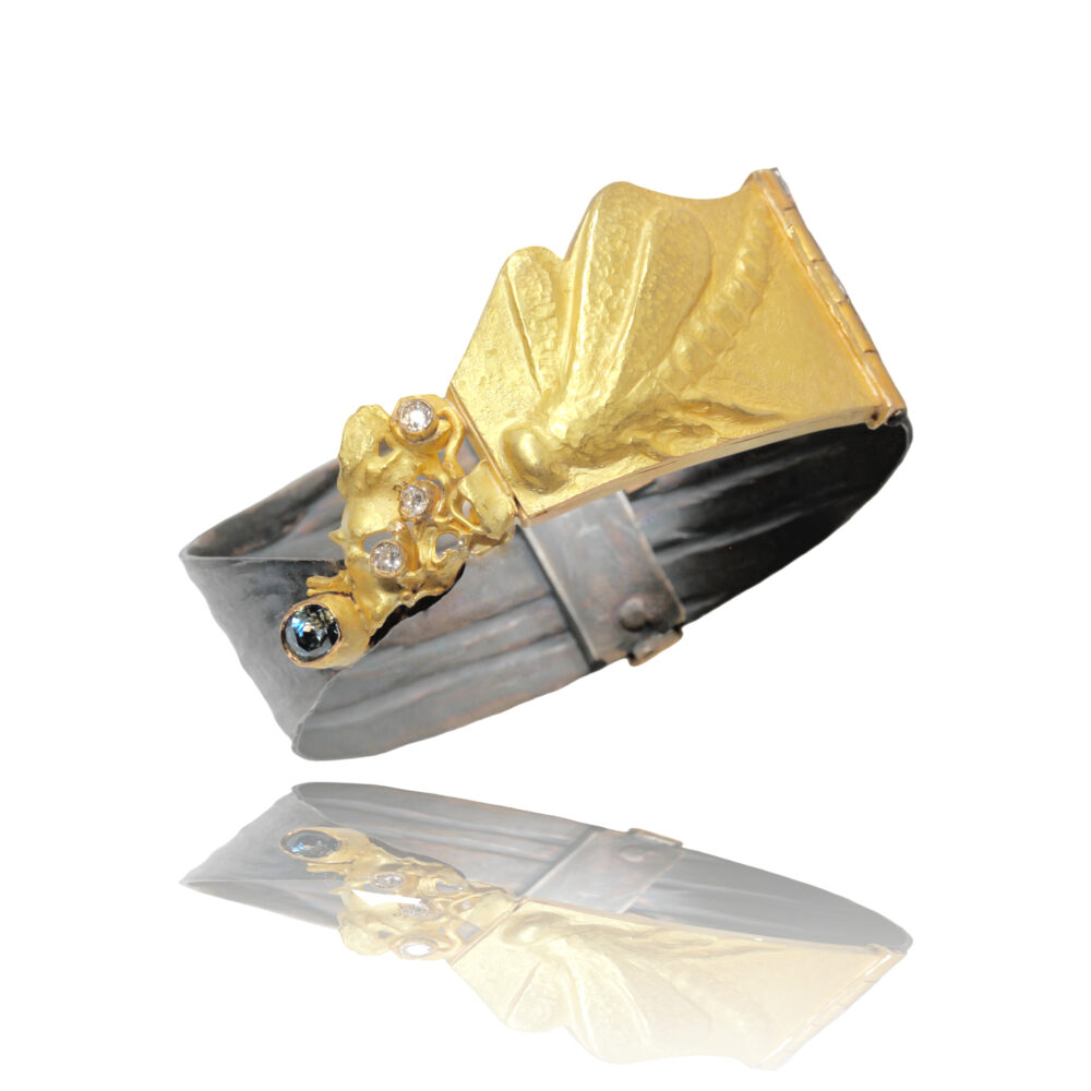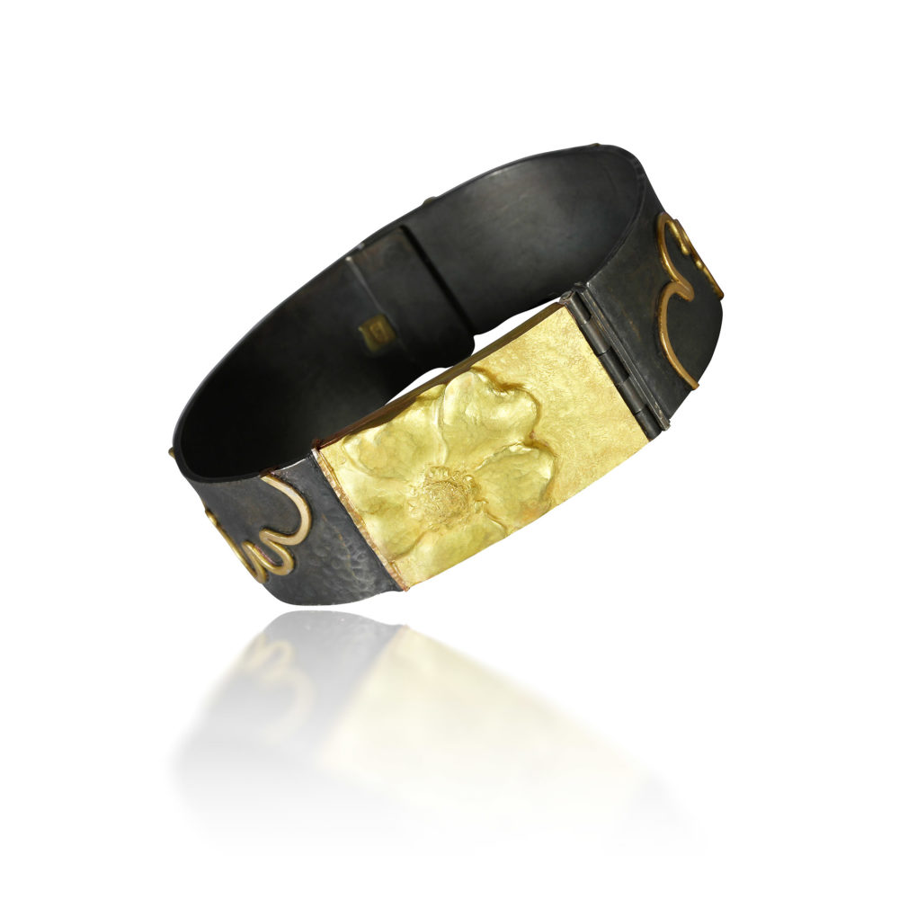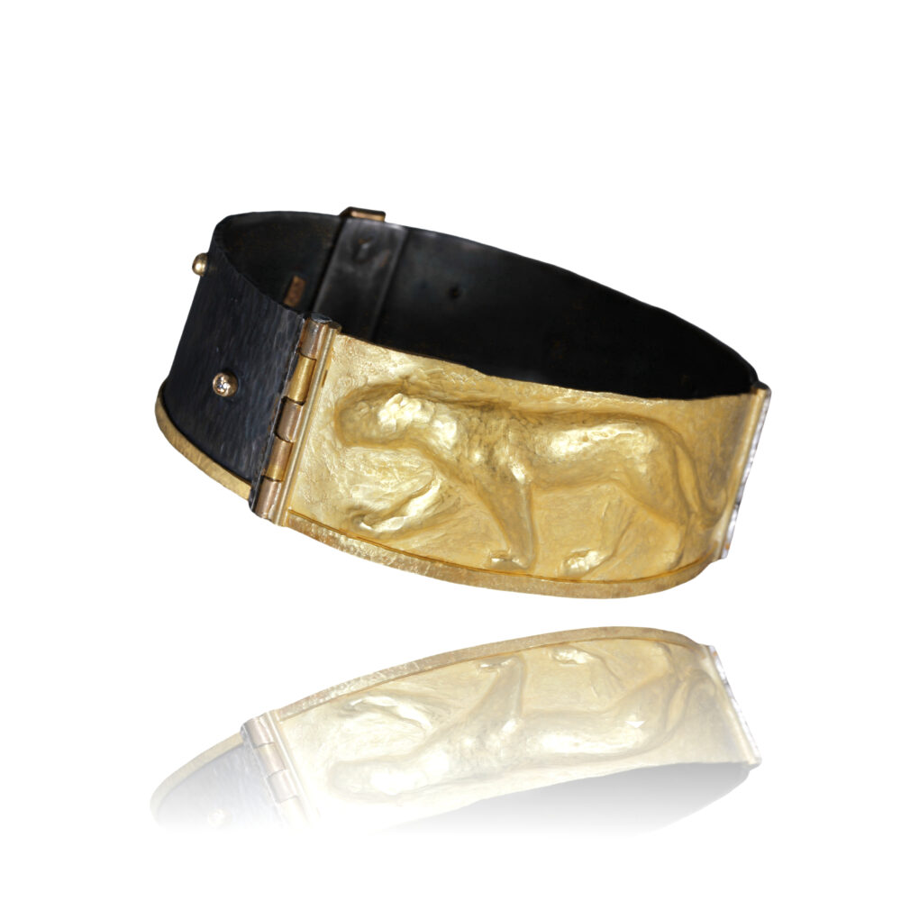 The rabbit is 14k repoussé gold with a wide chased patinated silver band. The band with the chased grass pattern is hinged and has a pressure fit clasp with safeties to secure it .