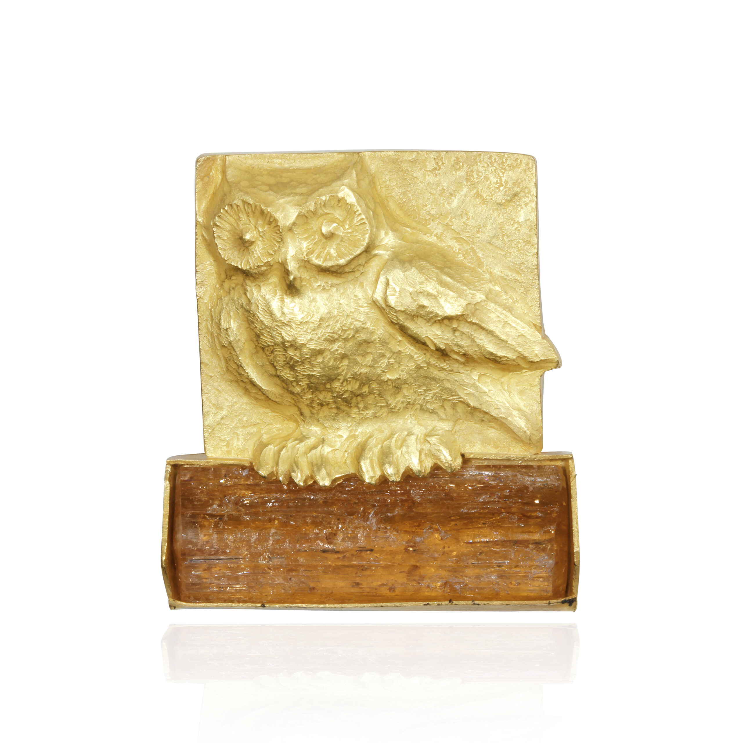 The short eared owl brooch/pendant is standing on a topaz crystal.