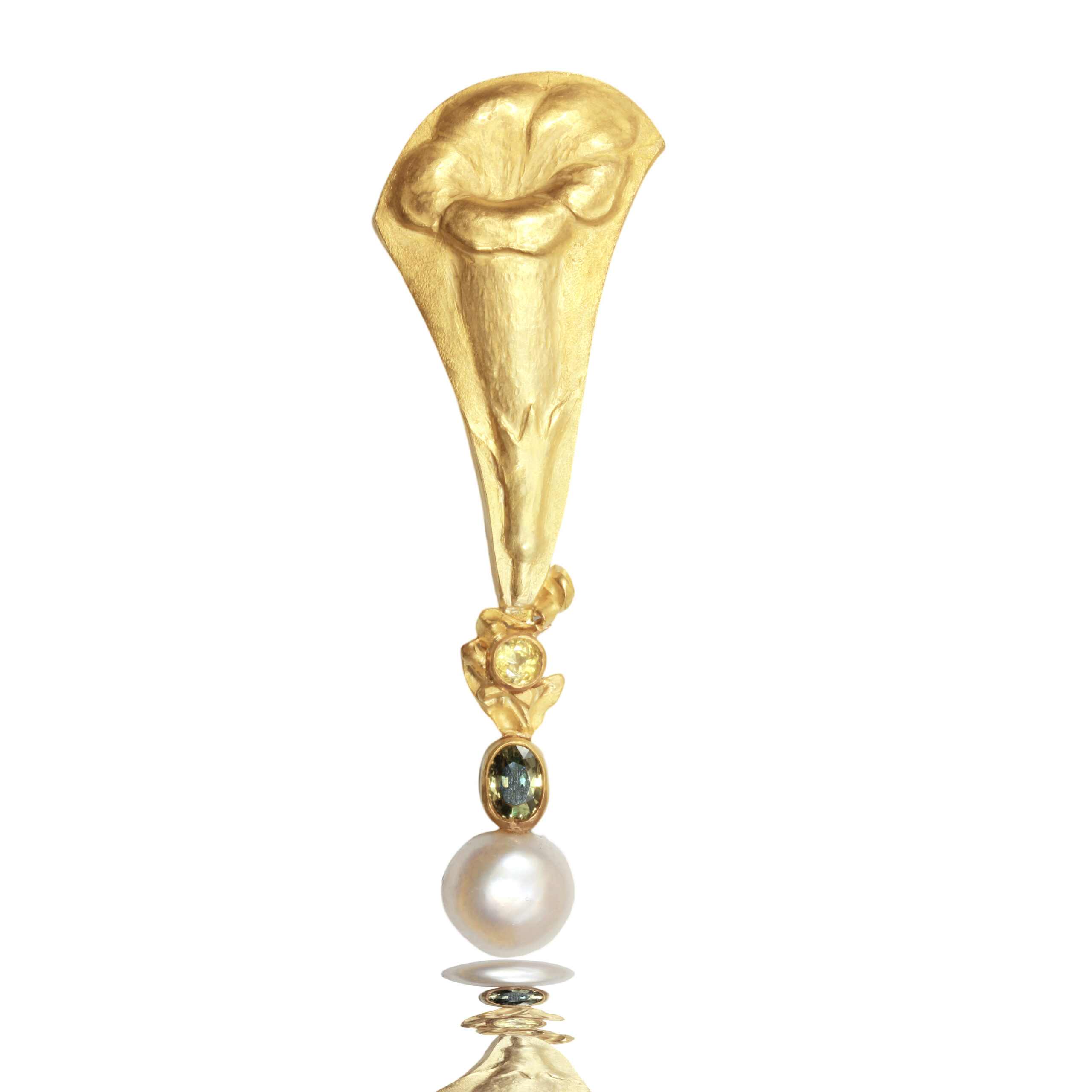 The 14k repoussé single jasmine is a brooch/pendant.with a yellow sapphire and a 1.19ct green sapphire, the pearl on the bottom.represent the seed.