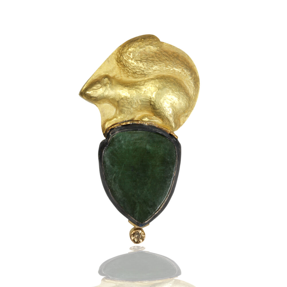 The 14k repoussé gold squirrel is sitting on top of a jade leaf which is 19.87ct. There is a 23pt sapphire set in gold at the very bottom of the pendant. The jade is set in silver.
