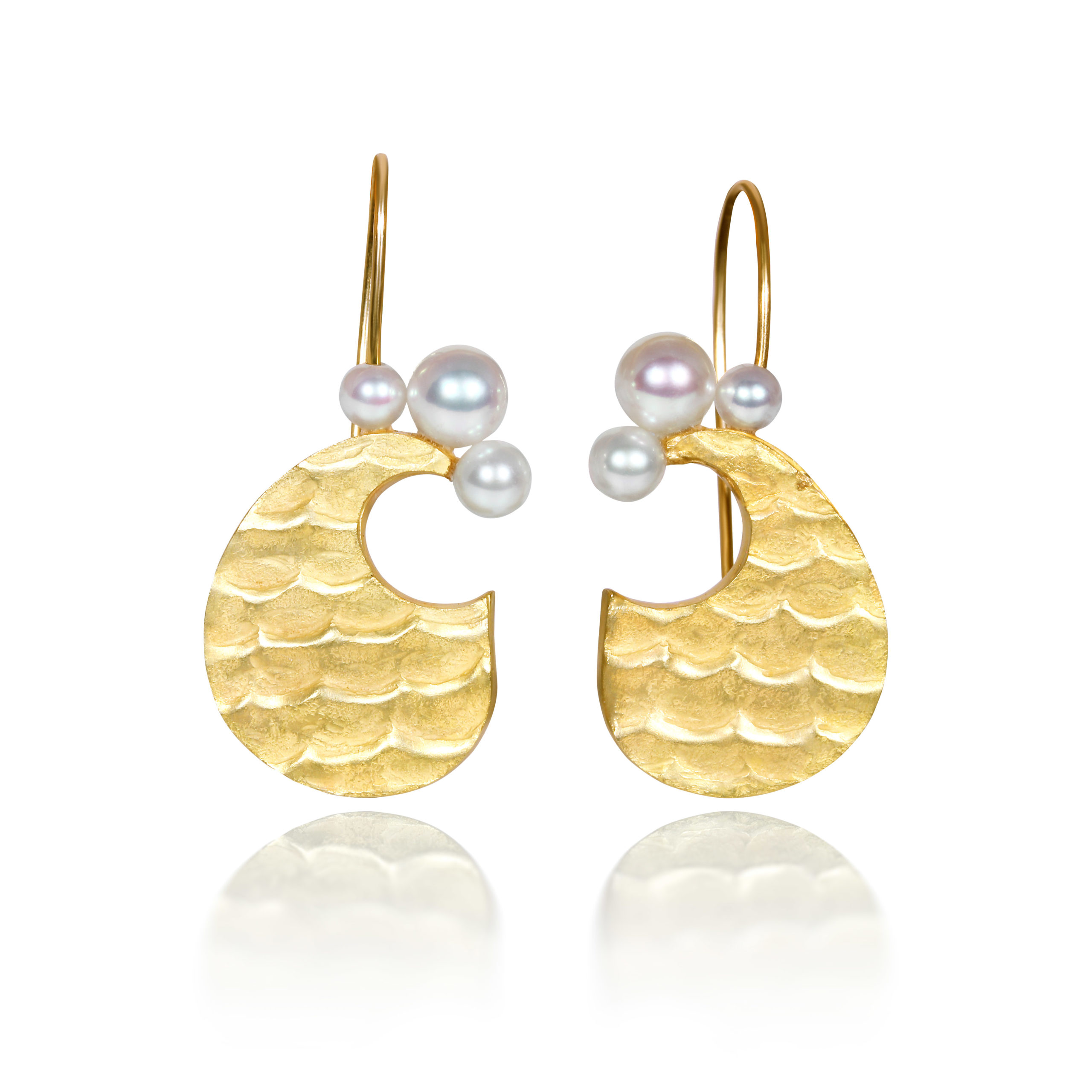 The earrings are 14k gold with repoussé wave texture. with pearls