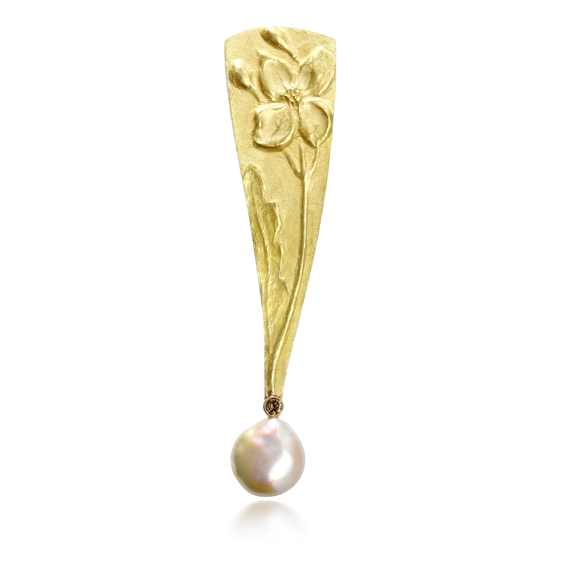 This wild flower is a 14k gold brooch/pendant has a 14pt brown diamond and pearl on the bottom.